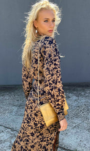 A very soft but sturdy leather  makes for a gorgeous statement bag with the Gold chain and inner Magnetic flat disc  hardware to close lid . Light copper colourway