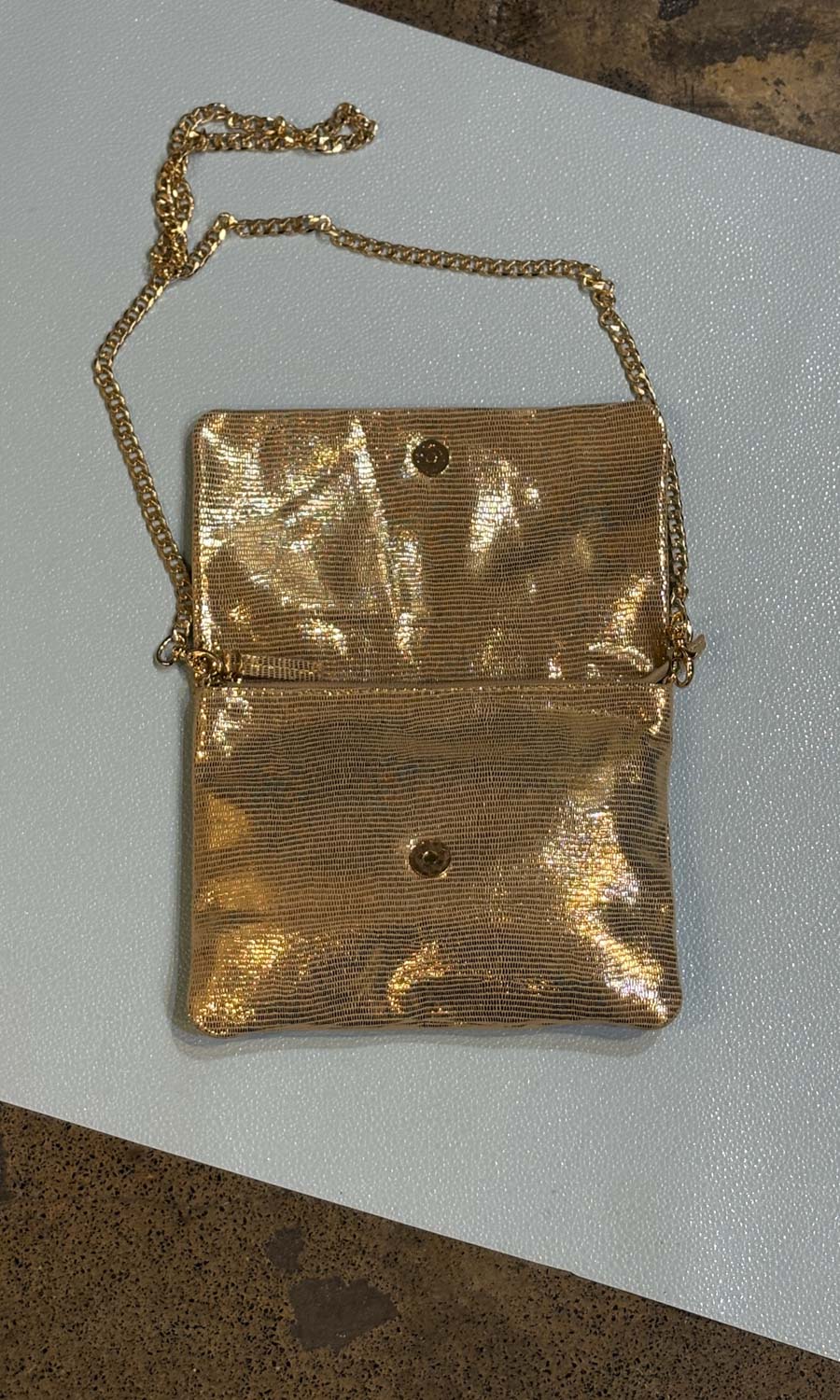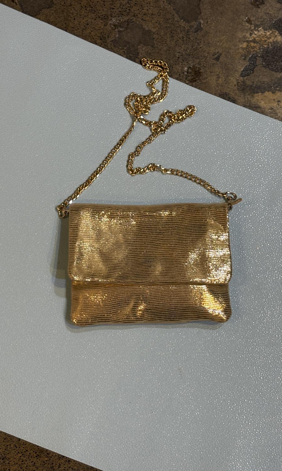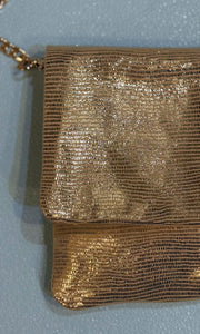 gold chain can be detached for a clutch style look if desired .