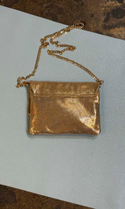 A very soft but sturdy gorgeous shade of gold glomesh leather .