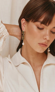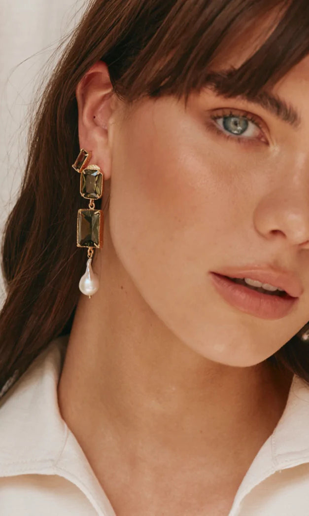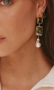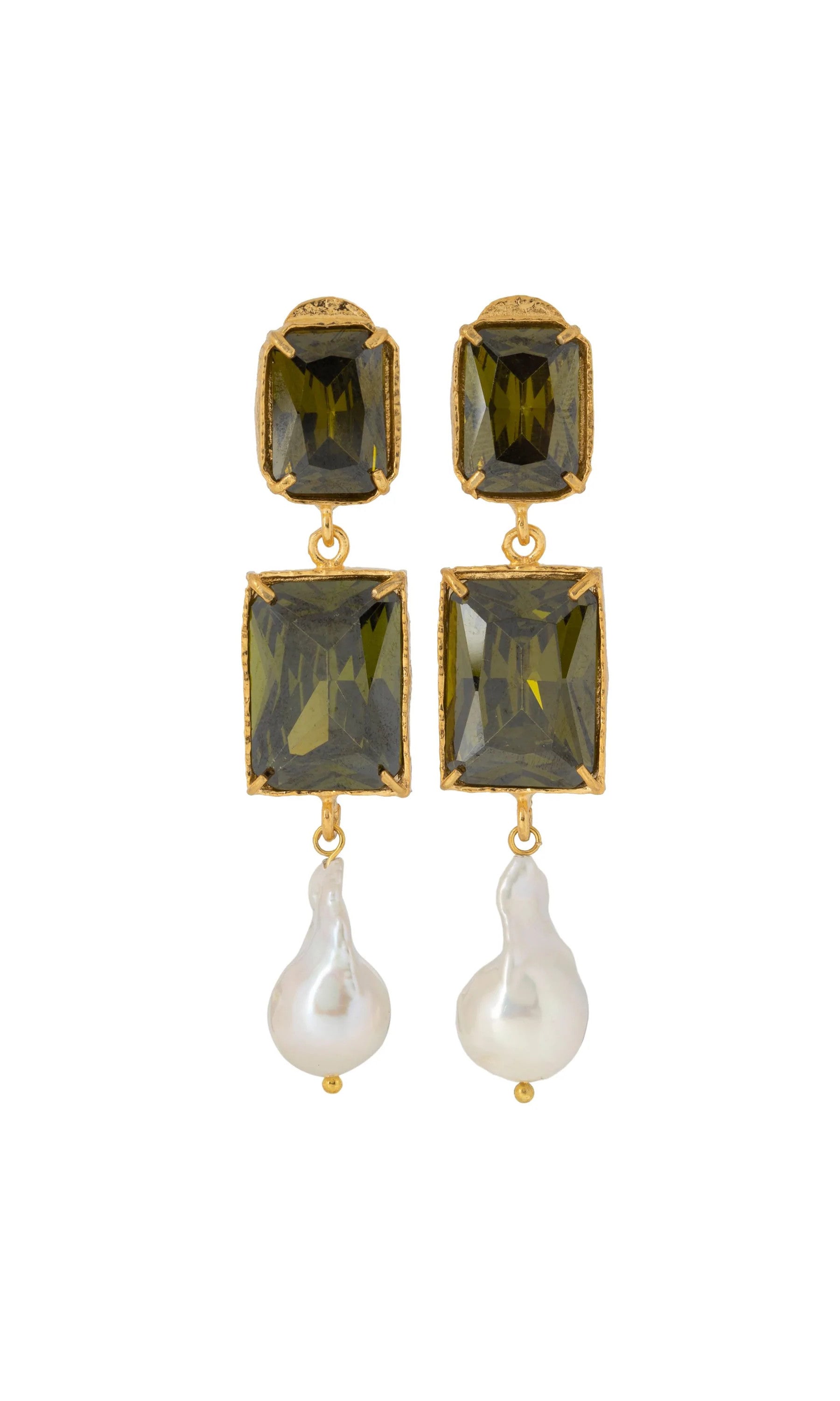 The handcrafted Alice earrings are adorned with dark, olive green crystals, accented by lustrous, freshwater Baroque Pearls.