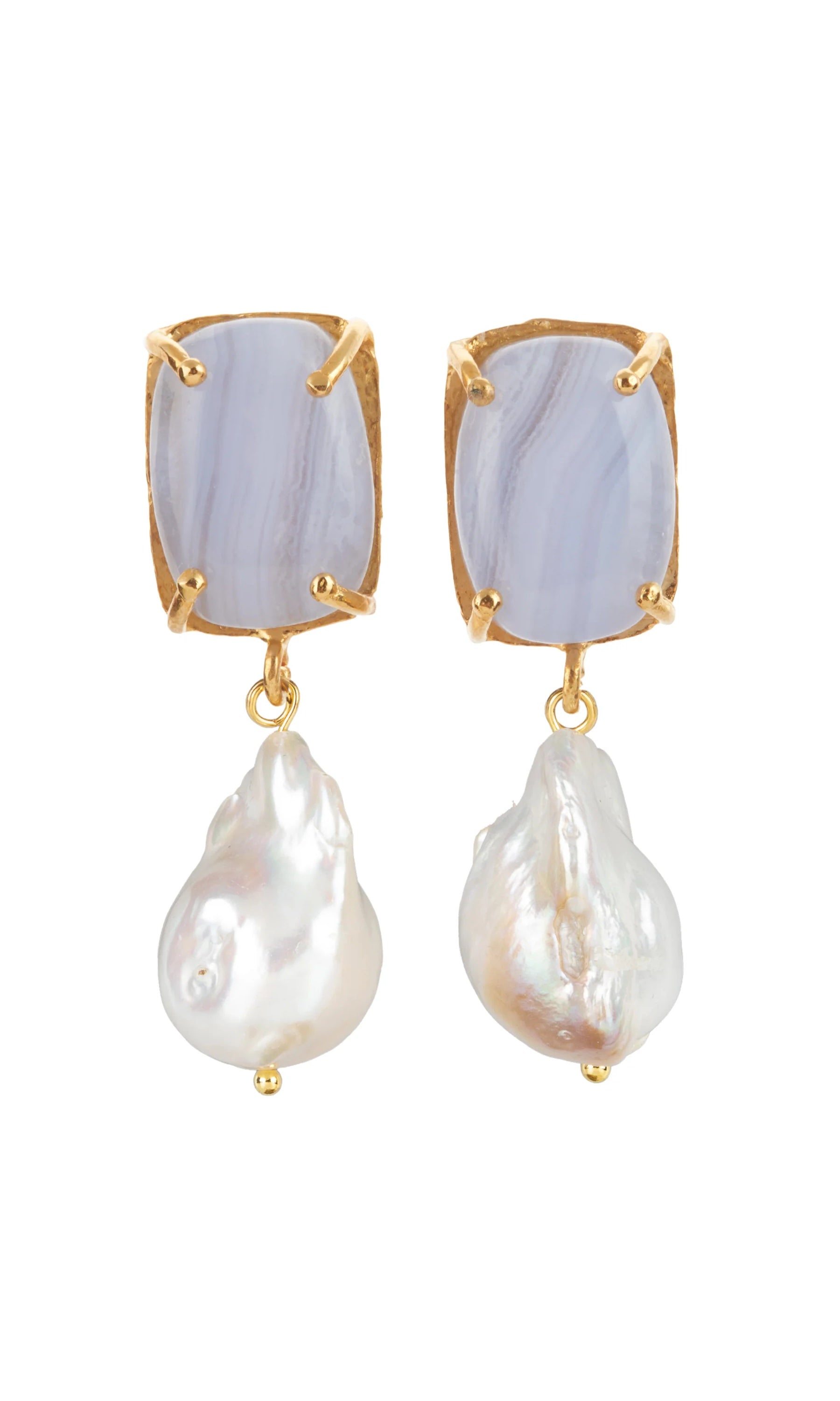 The handcrafted Piccola earrings are adorned with pale blue lace agate crystals, accented by lustrous, freshwater Baroque Pearls.
