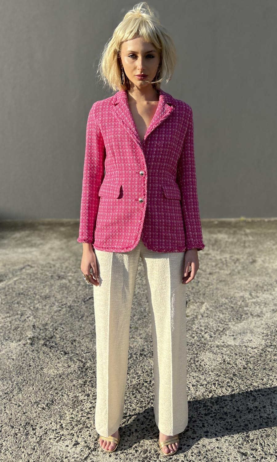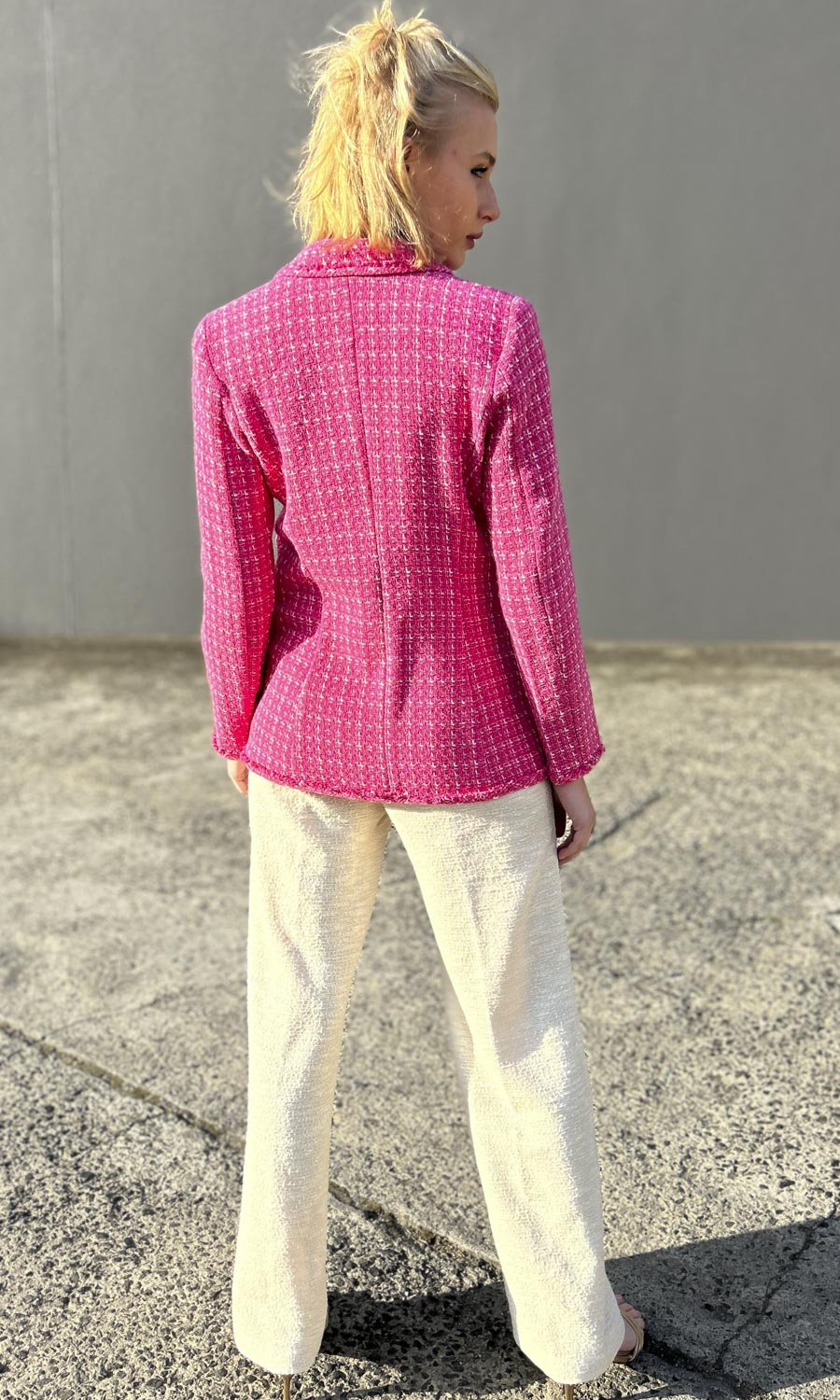 sizes 8 to 16 available   Worn back with the best selling Raphael Rossi Cream textured trouser . This trouser not online is in store.