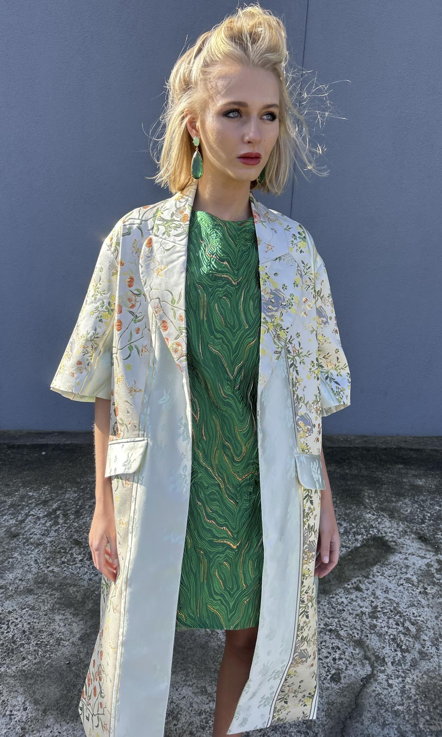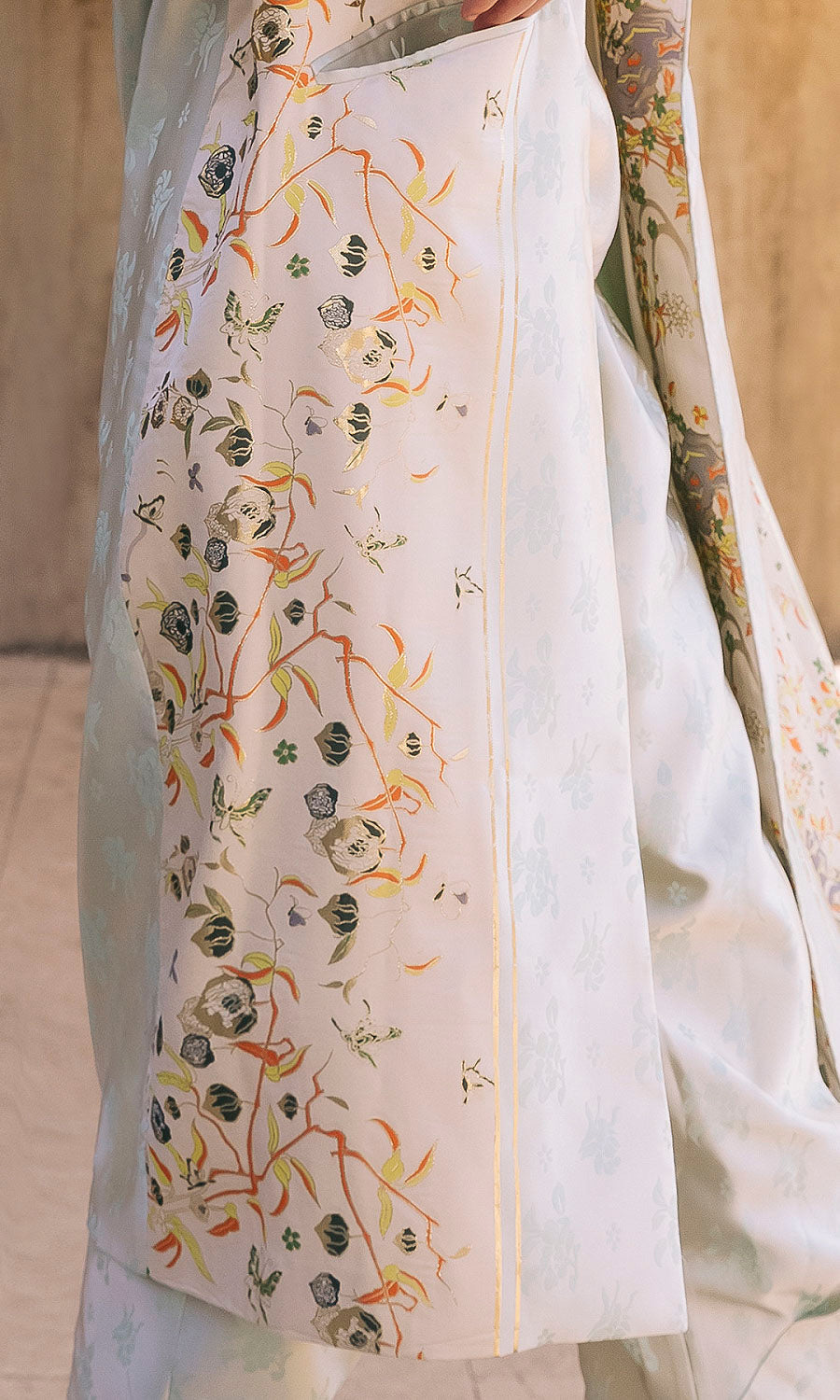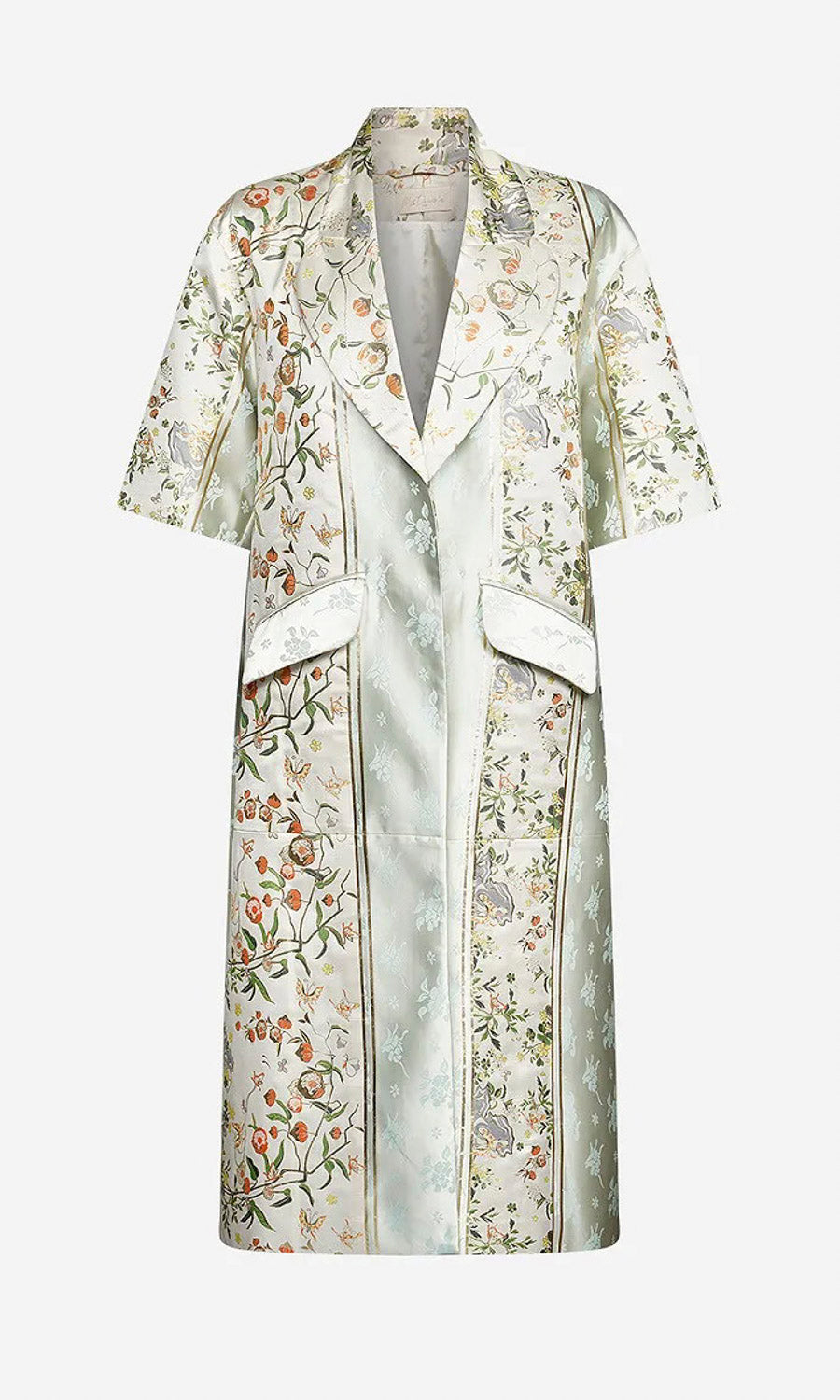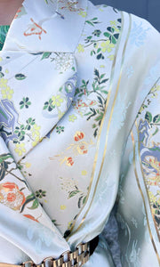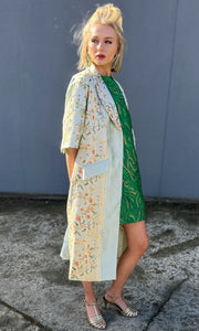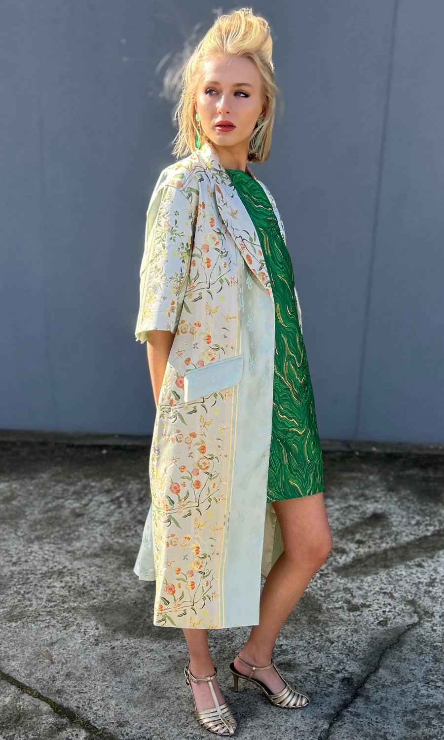 The zen flower Jaquard coat consists of the most beautiful delicate Palette mix of french inspired Mint ,soft orange , green, gold and silver .