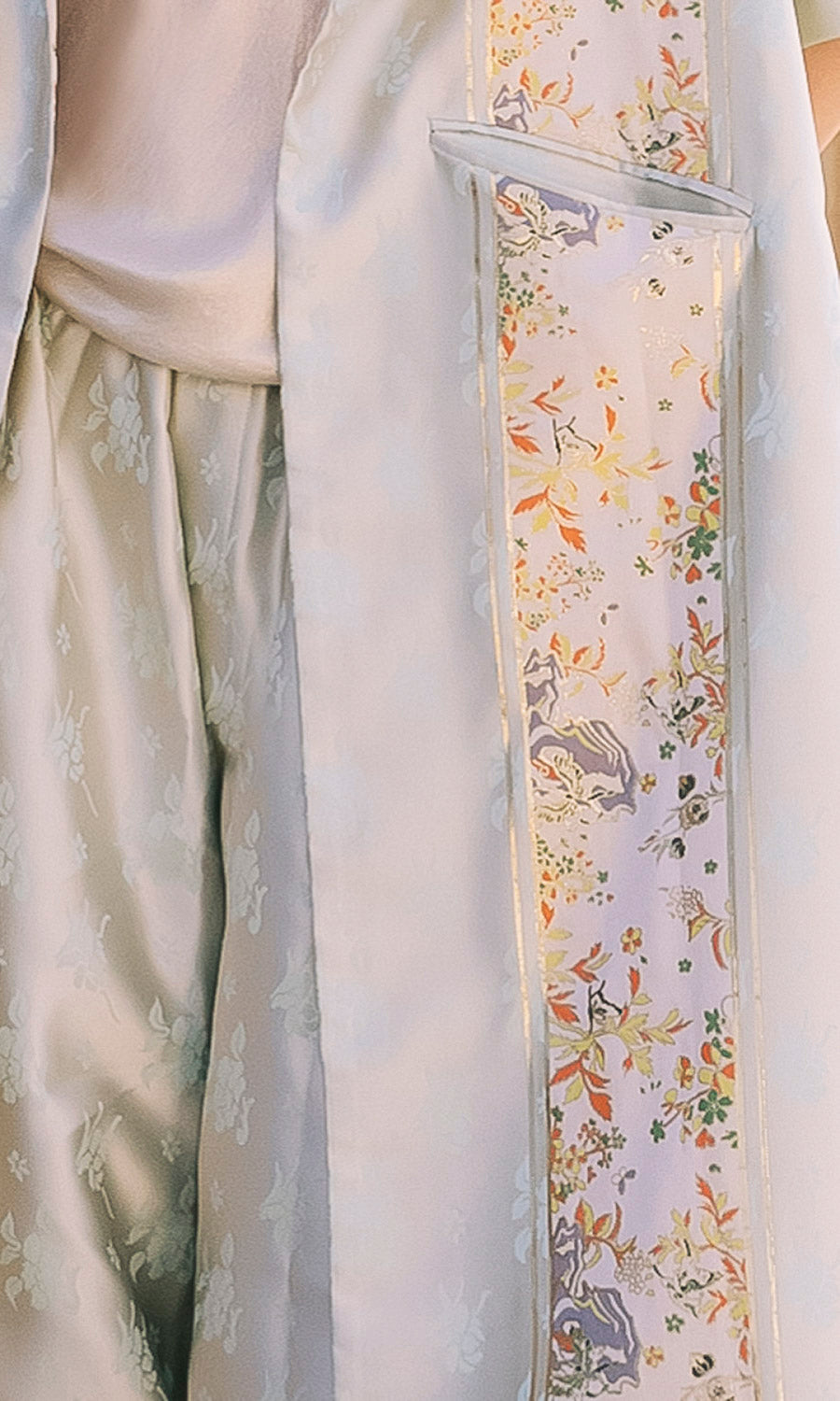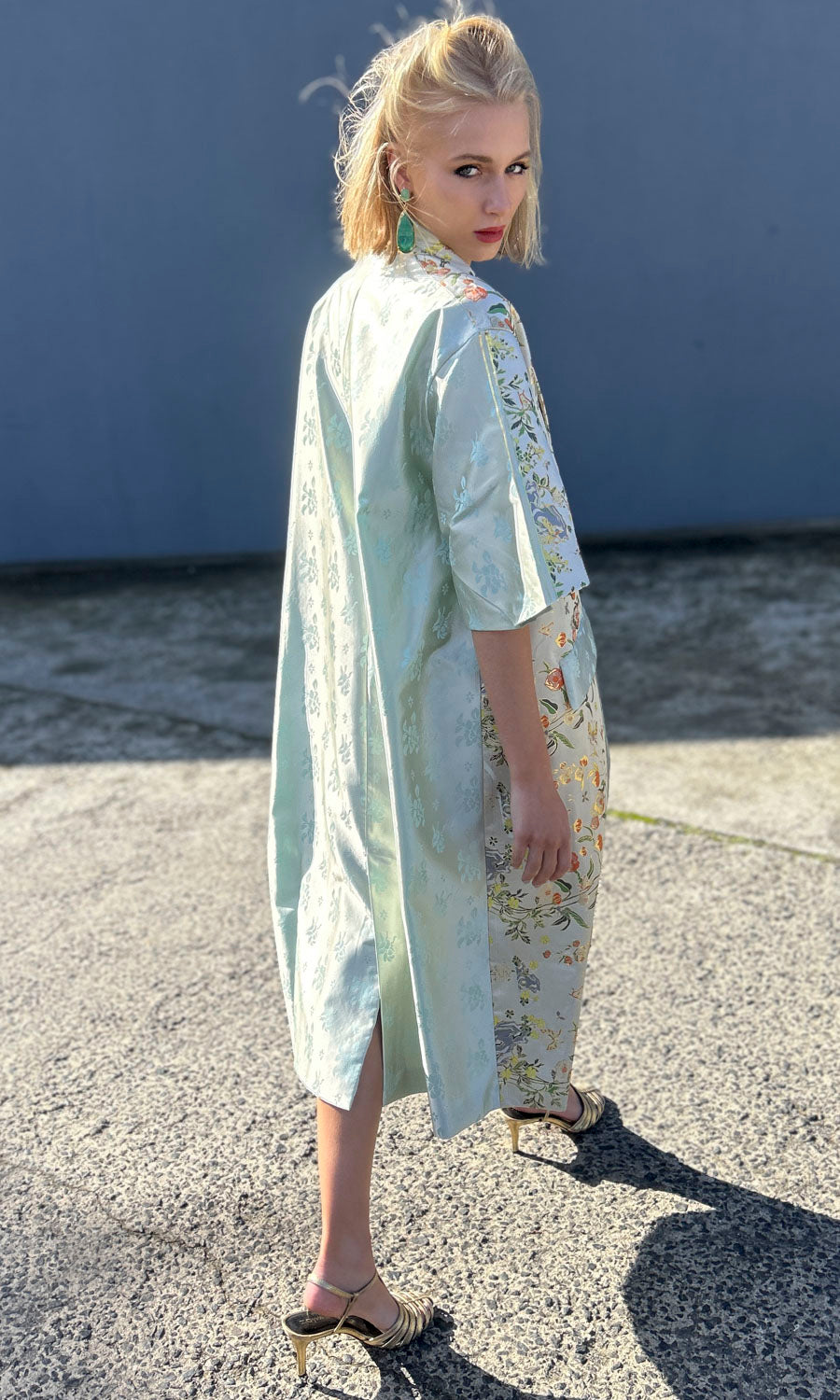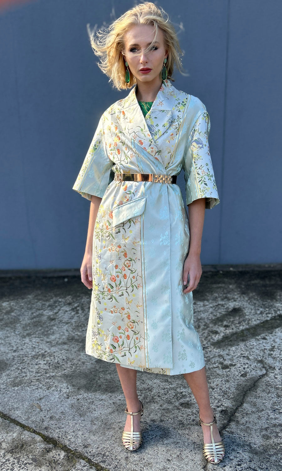 The zen flower Jaquard coat consists of the most beautiful delicate Palette mix of french inspired Mint ,soft orange , green, gold and silver .