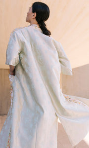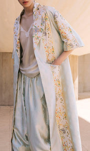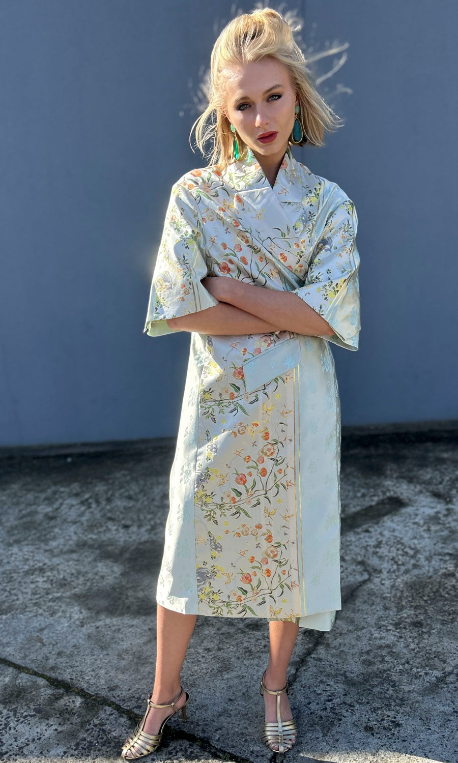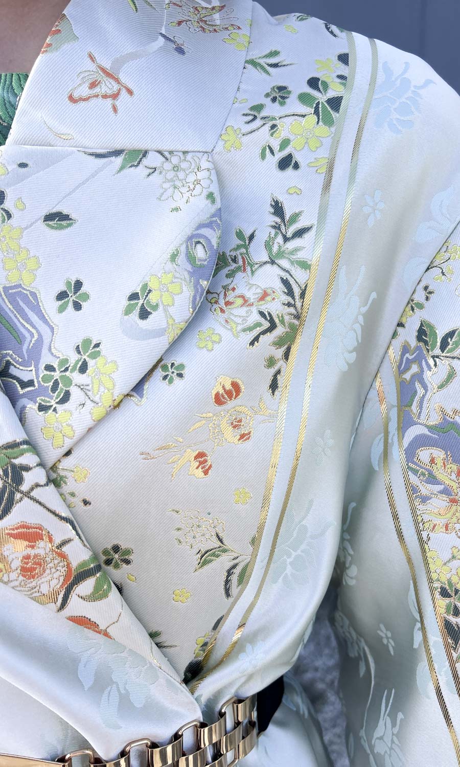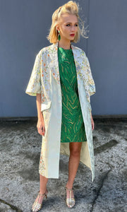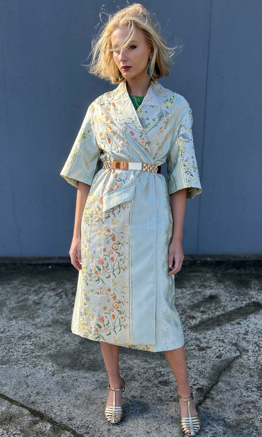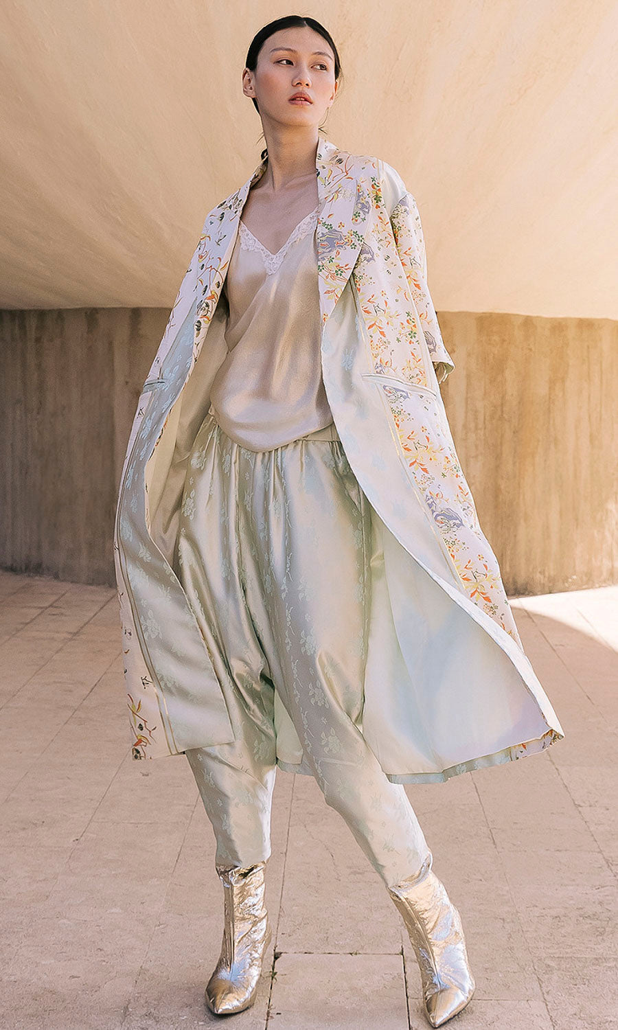 The zen flower Jaquard coat consists of the most beautiful delicate Palette mix of french inspired Mint ,soft orange , green, gold and silver .