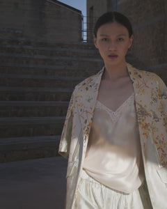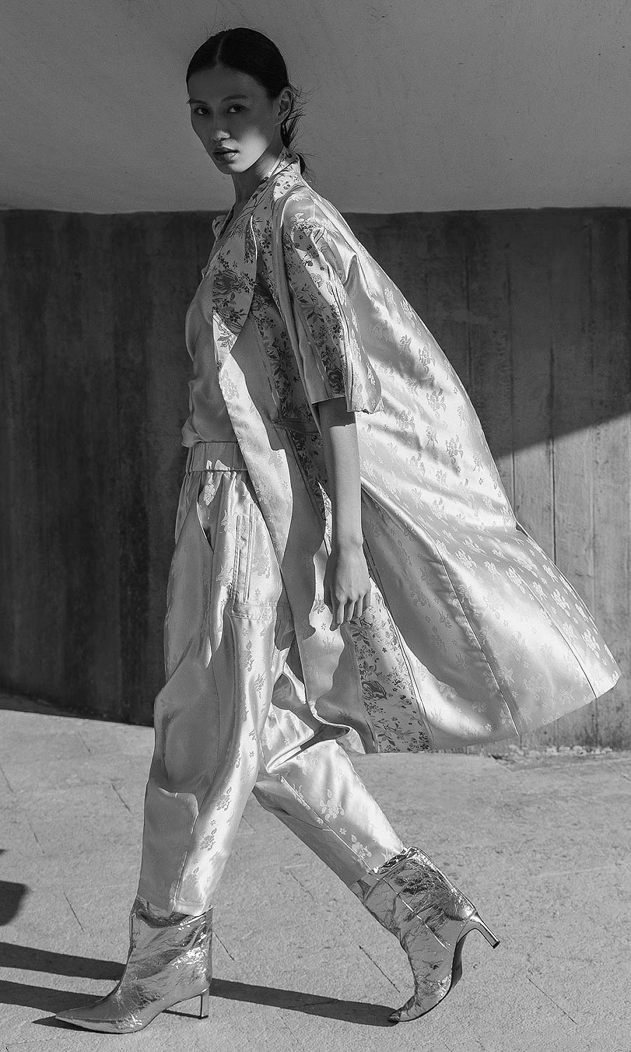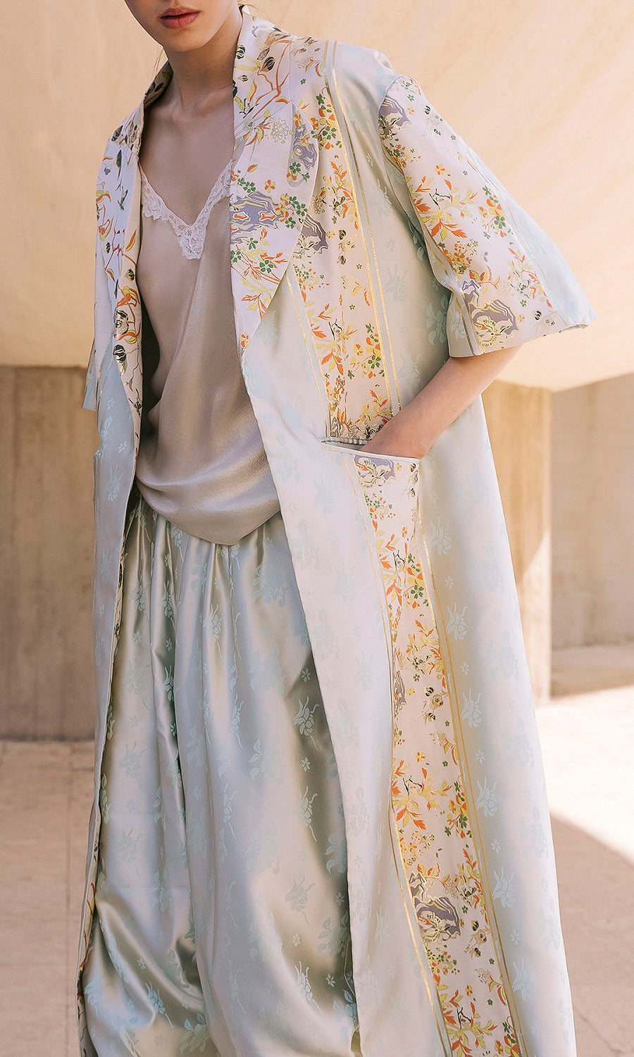 Sateen Polyester w Lurex thread.The 3/4 sleeves, the shawl neckline and the lapel pockets express an oriental inspiration.