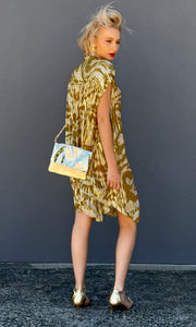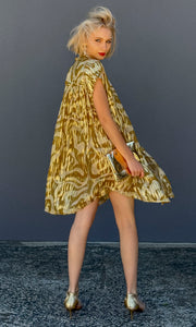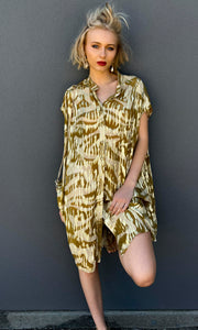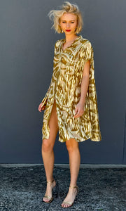 Round neck collar with covered buttons to end of dress, model shot has last 3 buttons open at front.