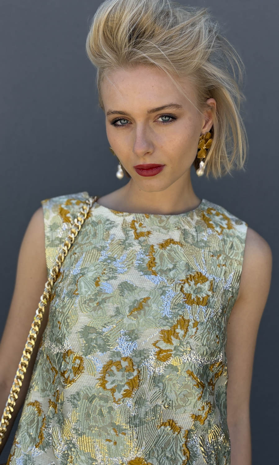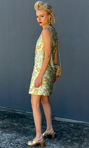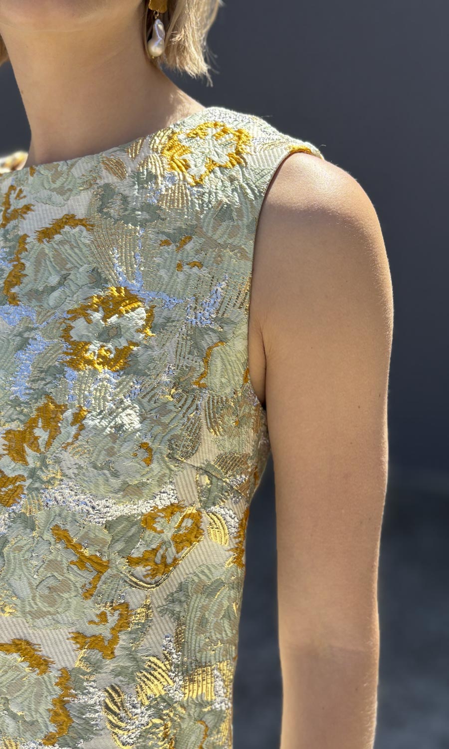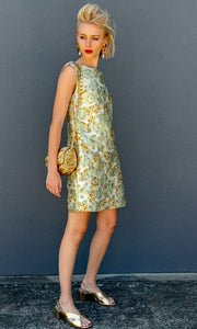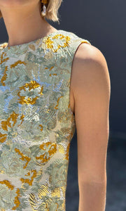 Mint /Gold . Stunning classic sleeveless shift dress shape made from French imported Silk brocade .