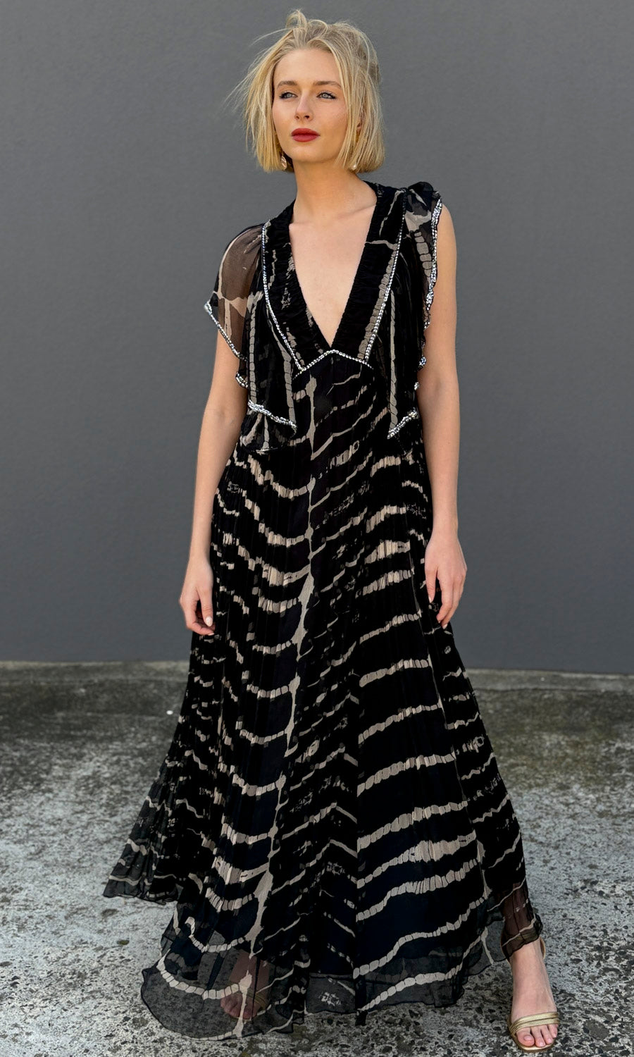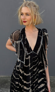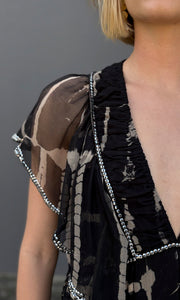 Silver stitched by hand sequin disc around sleeve ends , waistline and v neck.