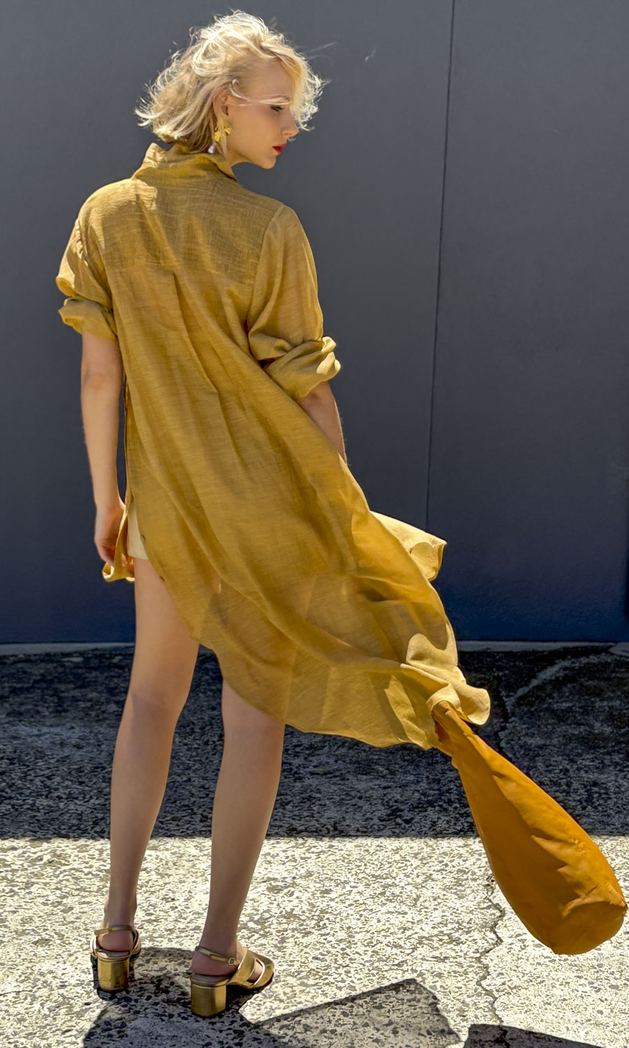 A flowing shirt dress with generous volume, enhanced by the soft sheen of ochre-colored SILK COTTON voile.