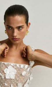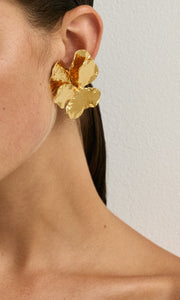 The Mia Earrings in gold are handcrafted with delicate, sculpted petals, creating a refined floral silhouette.