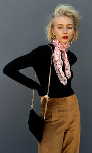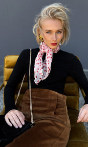 Classic shape Chiffon scarf. Hoss designed Polka dot red pink lightweight chiffon. . Dimensions: 88cm by 88cm Wash and wear gentle hand wash warm water . Dry in shade warm iron. Worn back with hoss black knitted Max skivvy and Dark gold Galliano Blake velvet 100% cotton trousers.