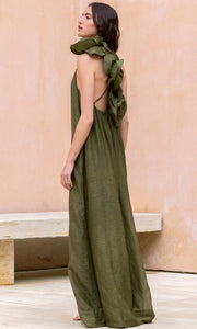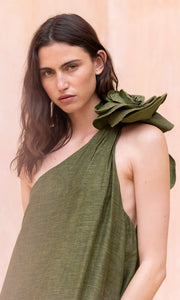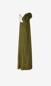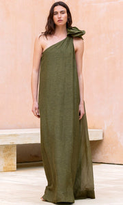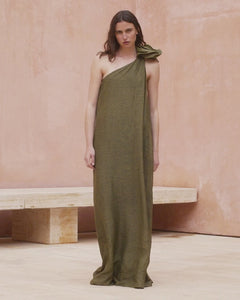 This long trapeze-shaped dress stands out through the noble look of its cotton and silk blend, in a deep, intense dark green.
