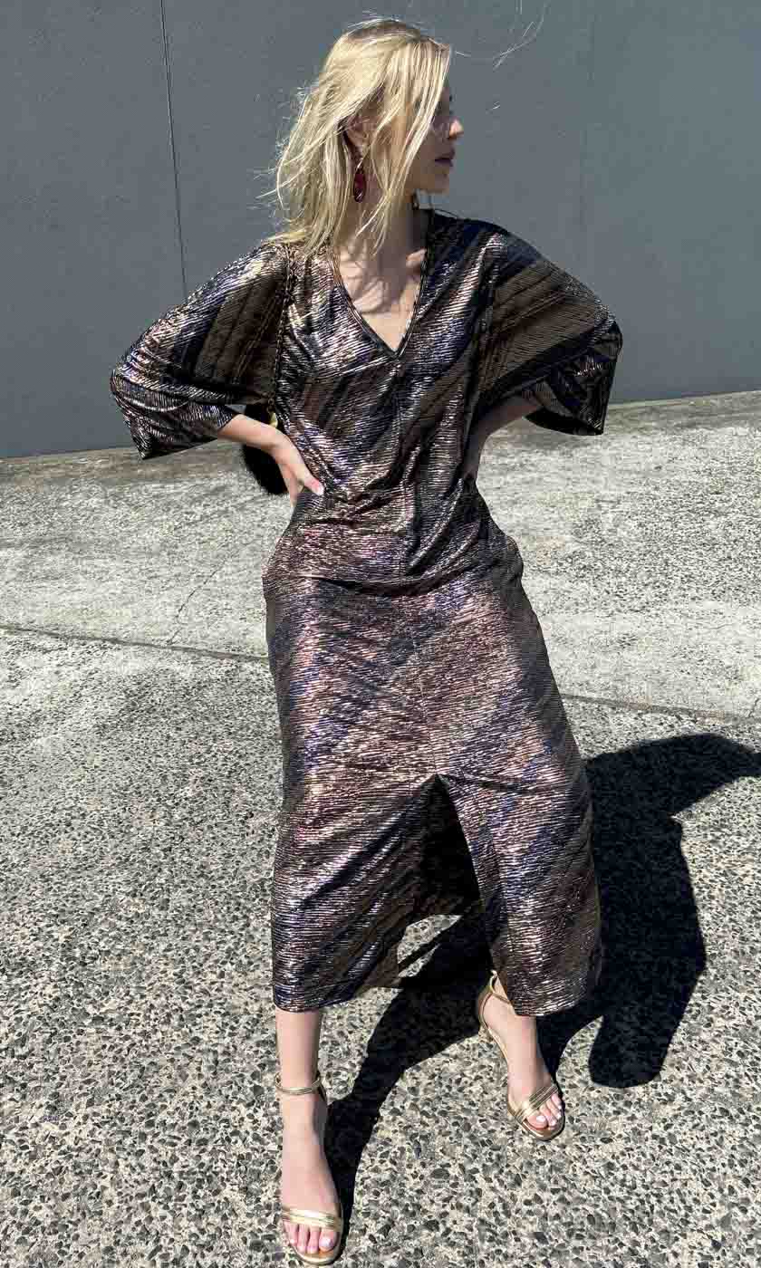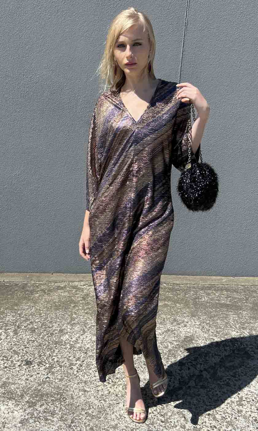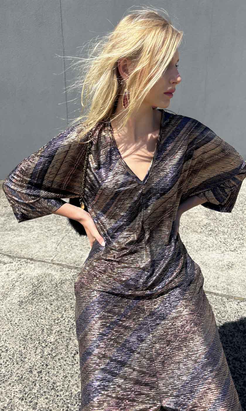 FABRIC: knitted viscose metallic , black inner viscose base lining 10% elastane.