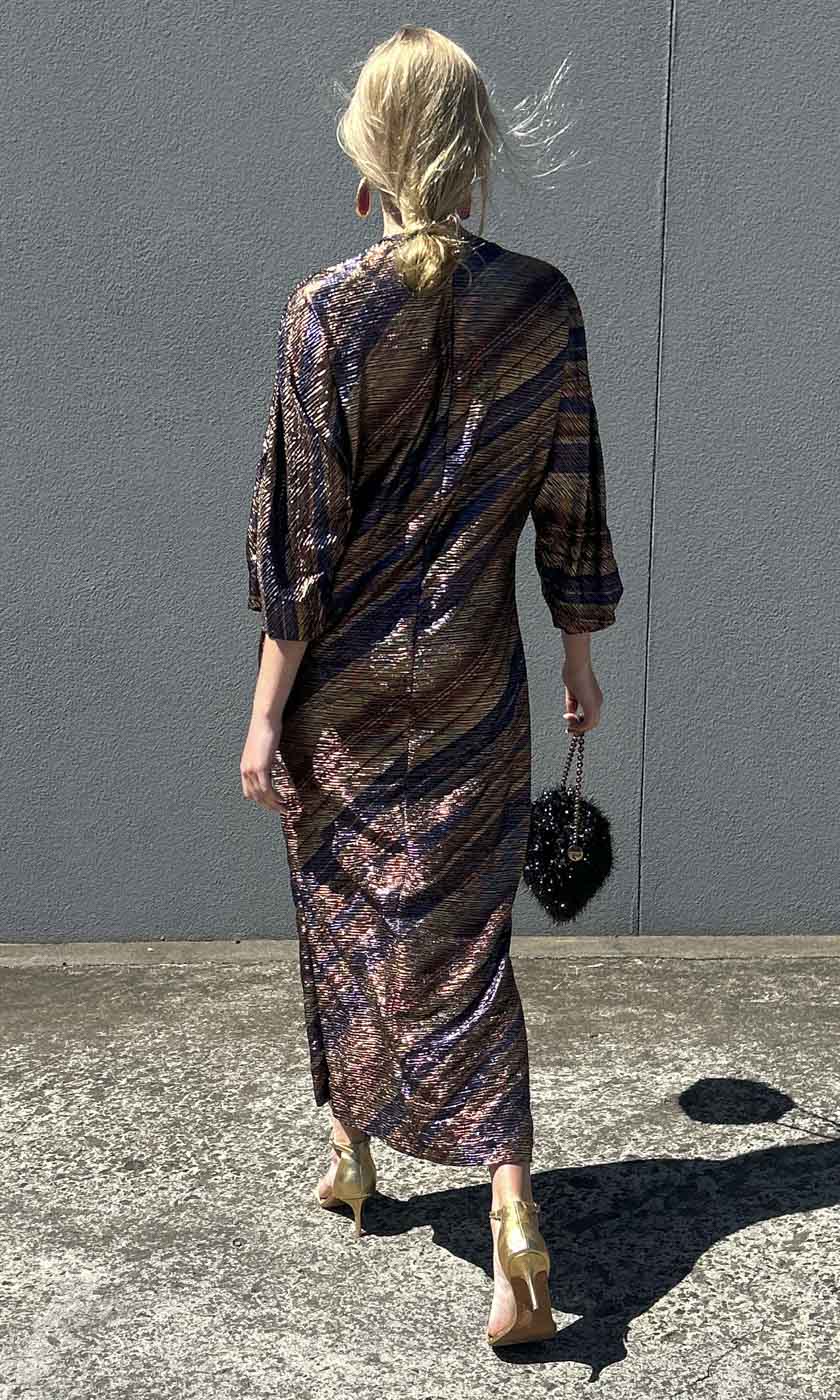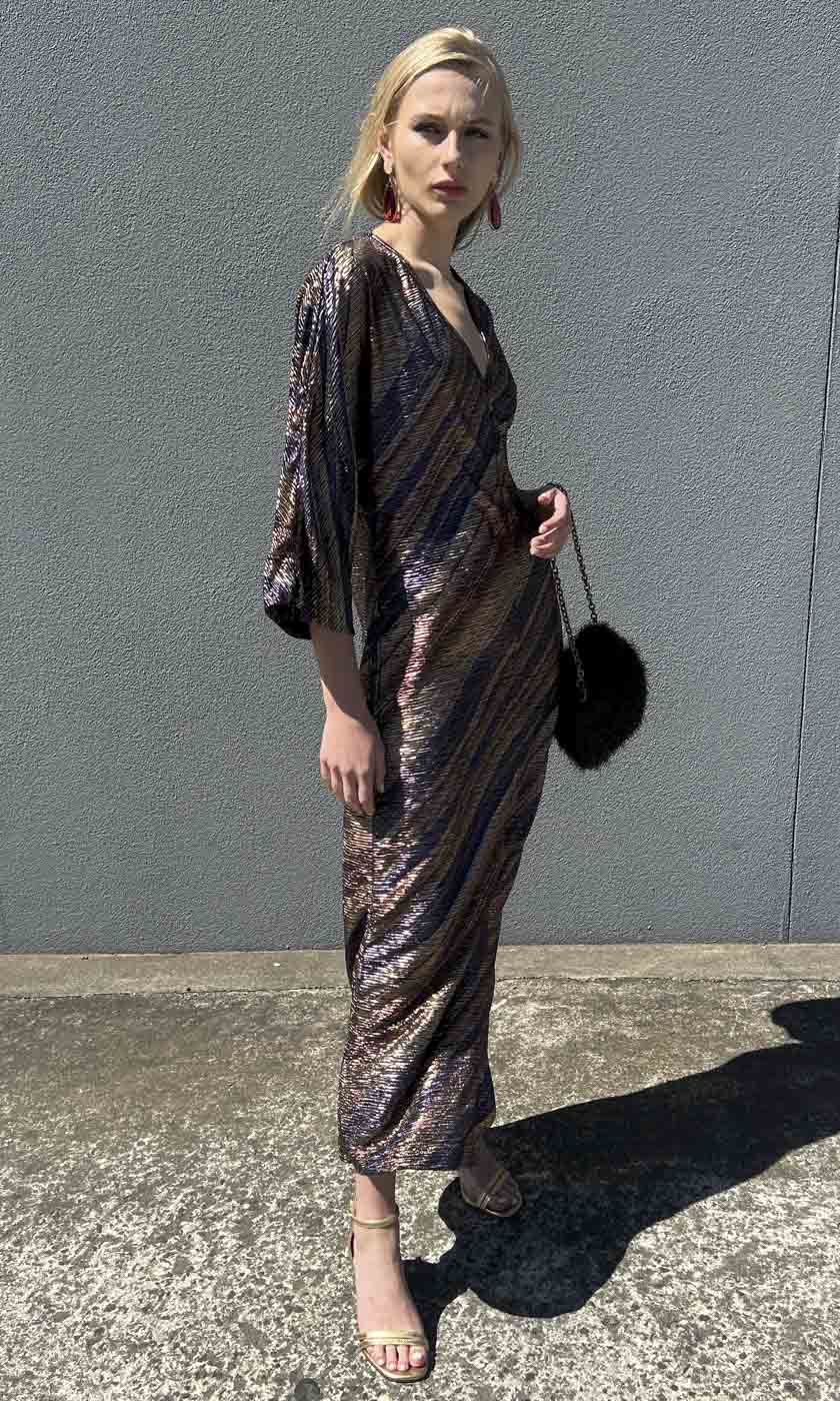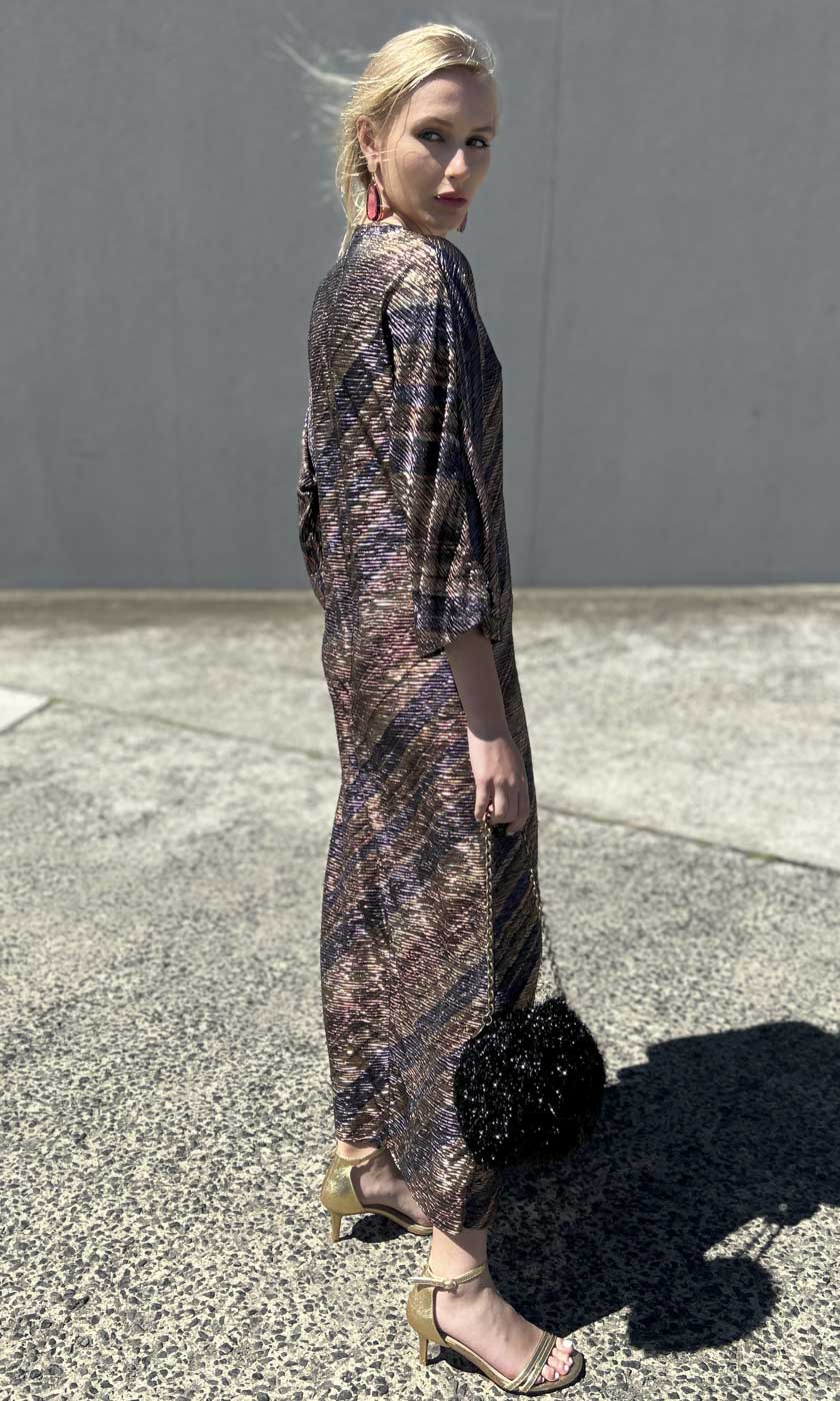 FABRIC: knitted viscose metallic , black inner viscose base lining 10% elastane.