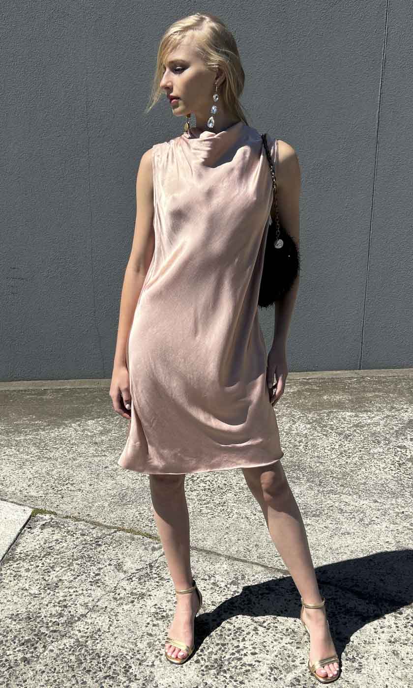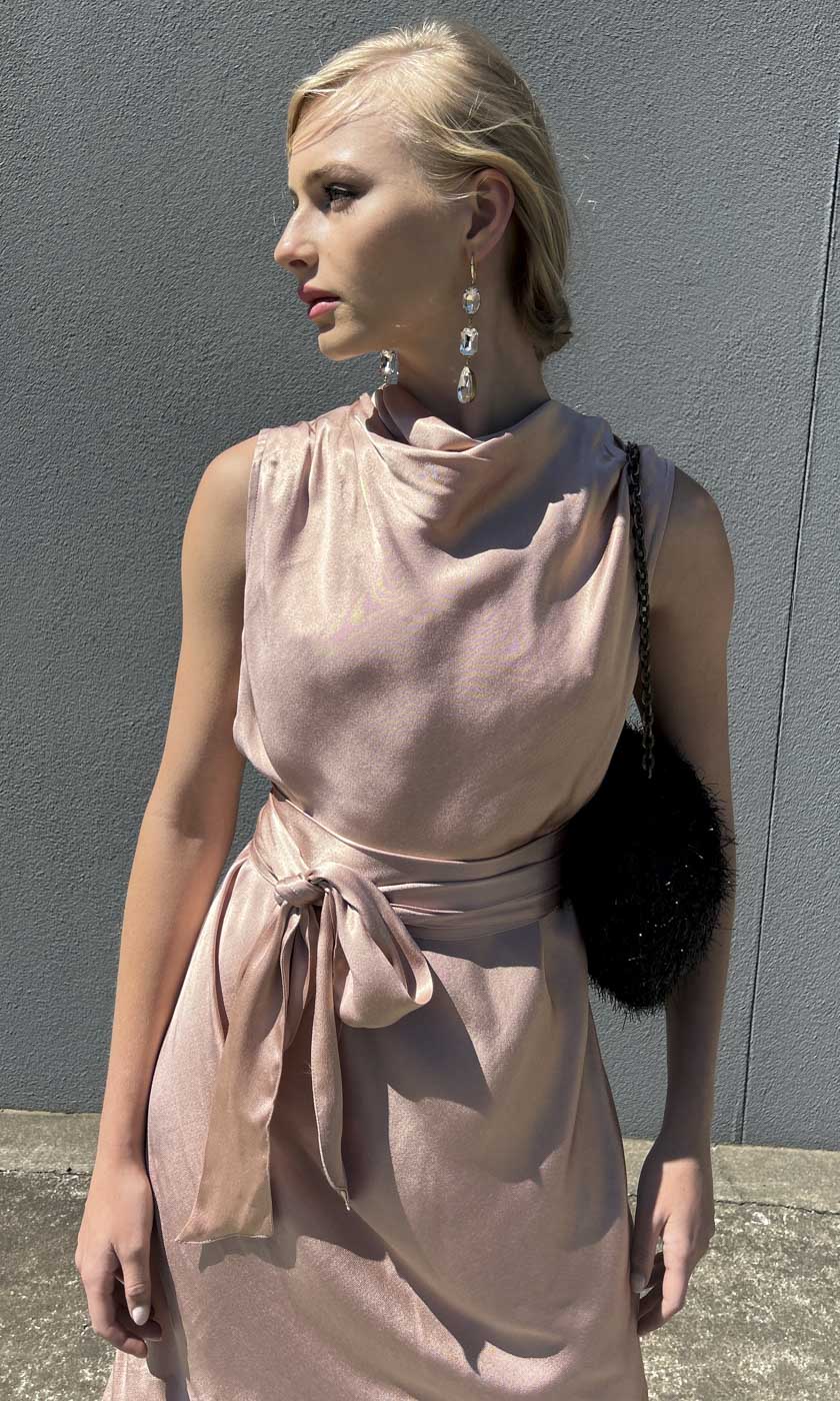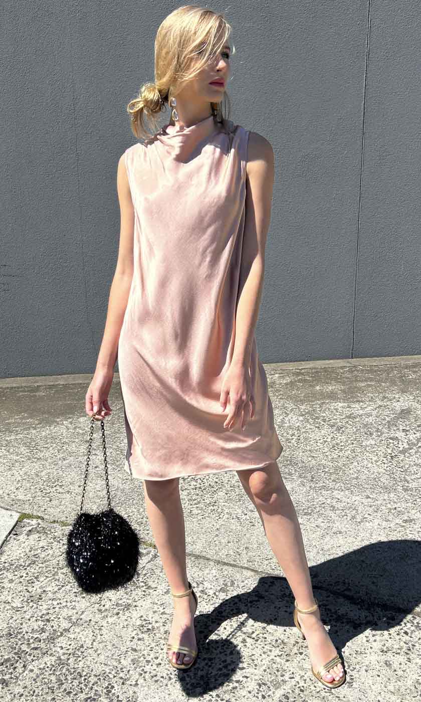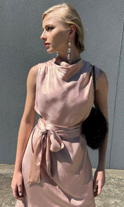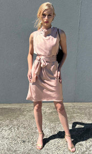 Classic cowl neckline, easy fit through body, wear with or without supplied belt, wrap belt twice around waist as shown.