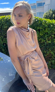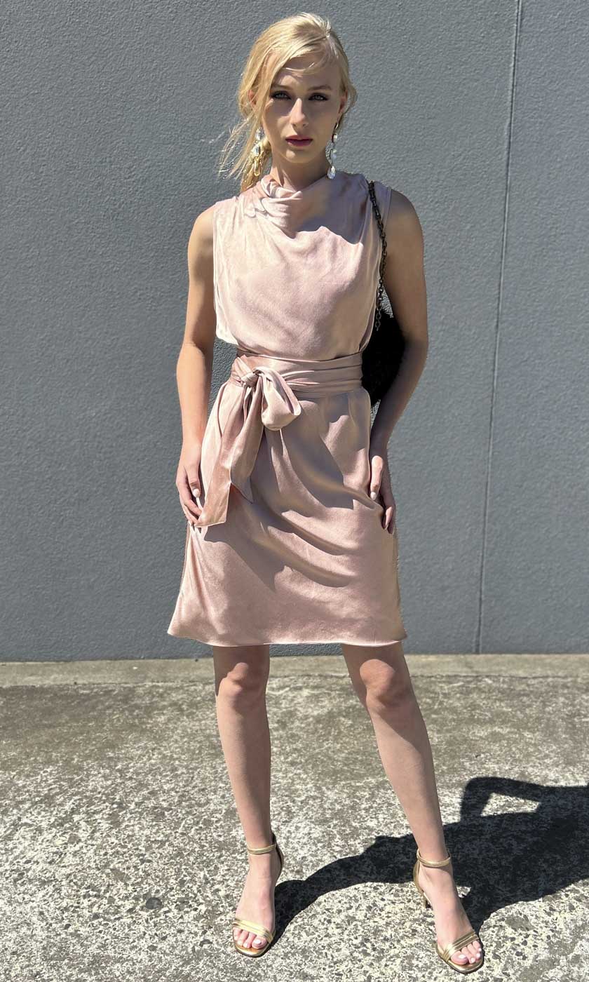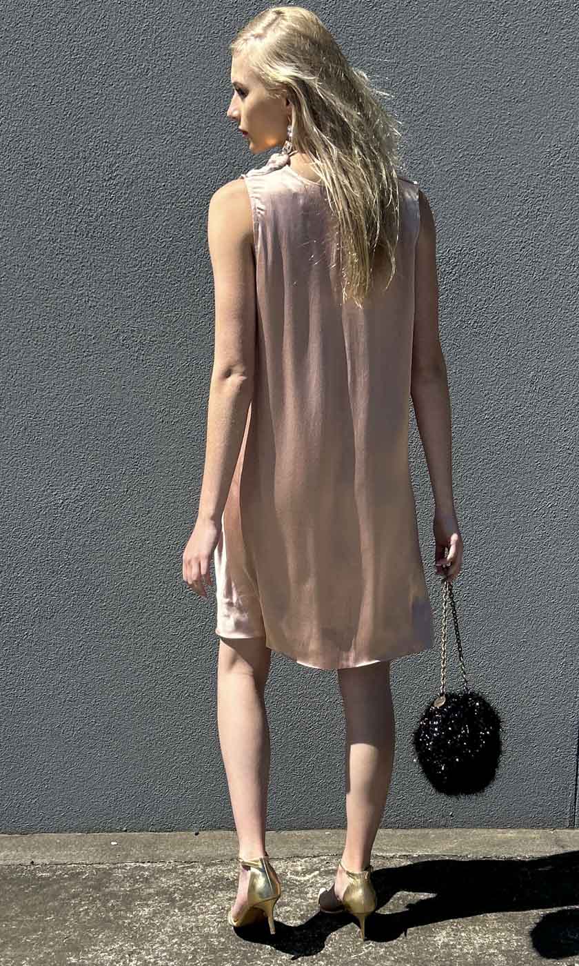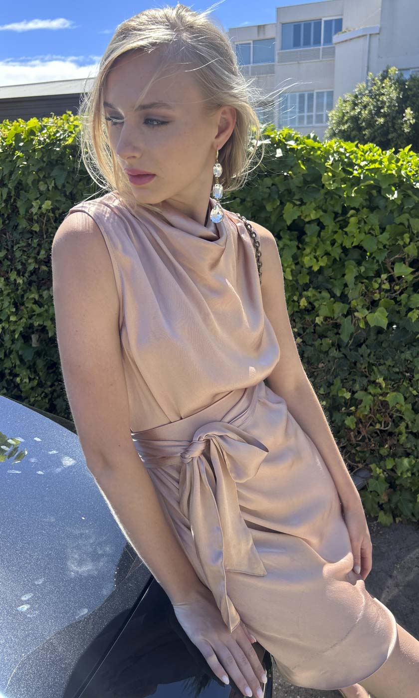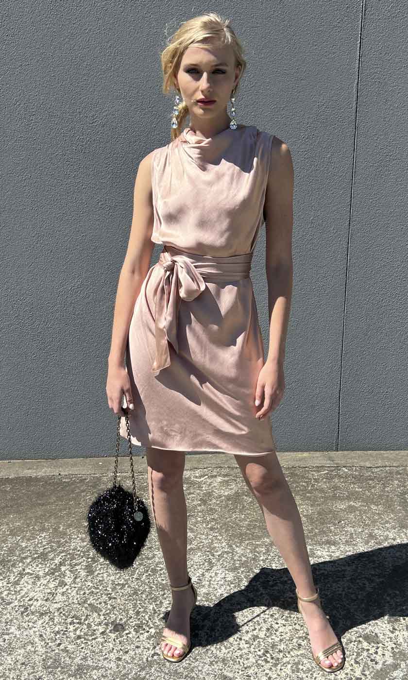 Classic cowl neckline, easy fit through body, wear with or without supplied belt, wrap belt twice around waist as shown.