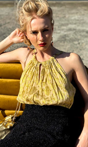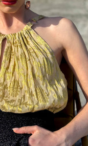 Fixed Gathering around neckline front and back with side Metal Ring hardware link.
