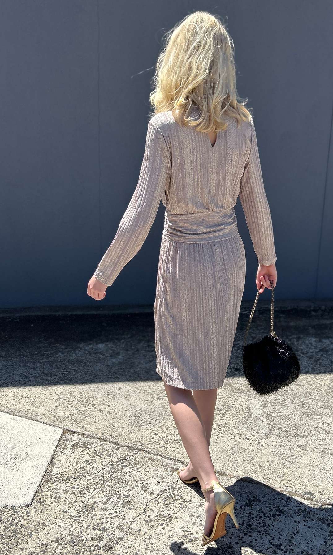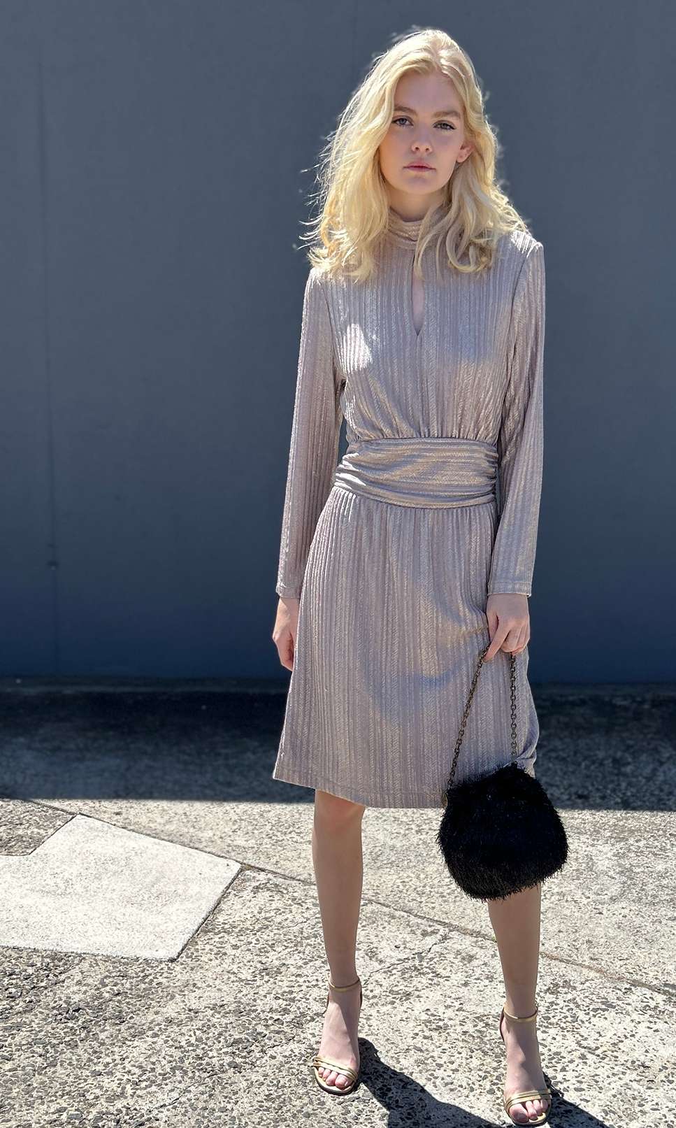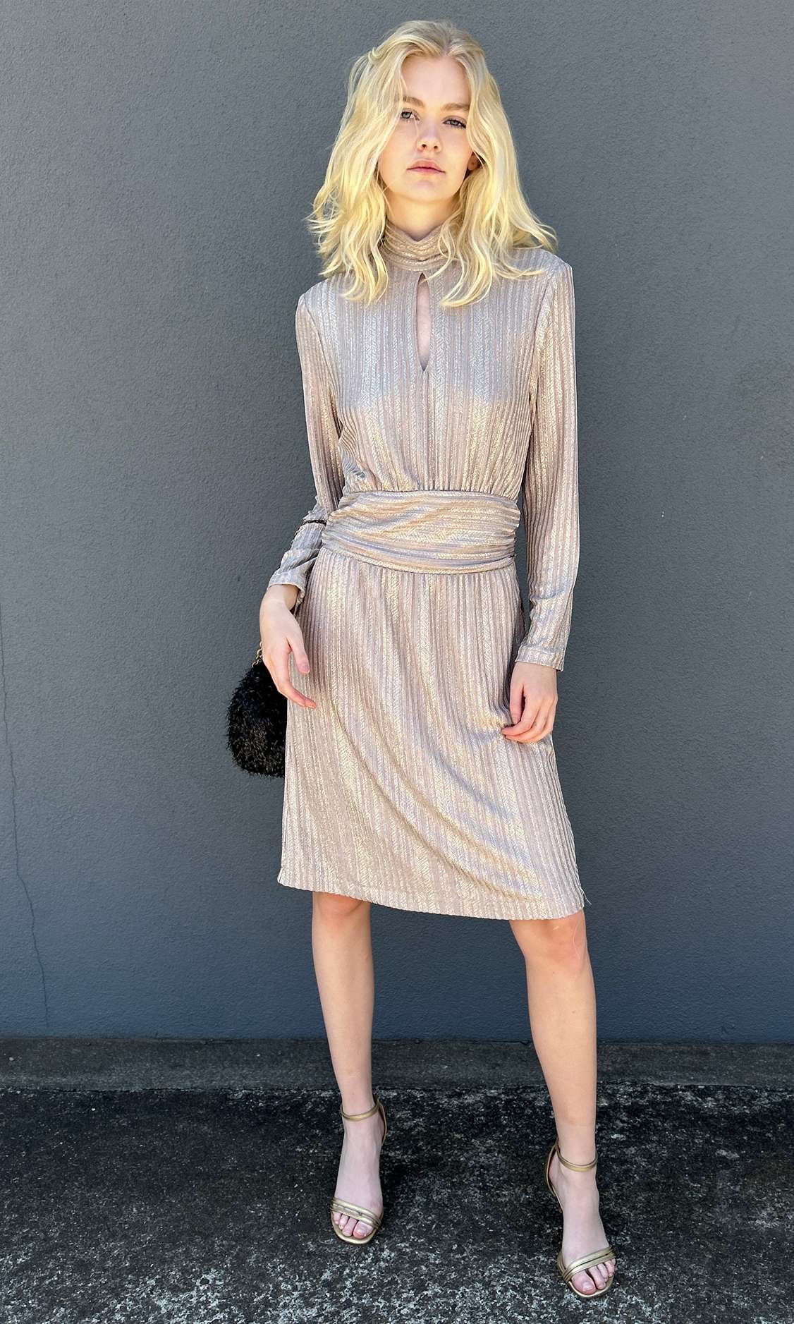 Soft knitted pale gold textured fabric on this gorgeous occasion dress.