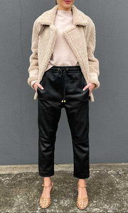 The Hoss Monsoon Leather Pants in black are a stylish and trendy pair of pants made from high-quality leather. These pants have a sleek and streamlined design, with a fitted silhouette that tapers down to a narrow ankle. They feature a mid-rise elasticized waistline and a leather tie in