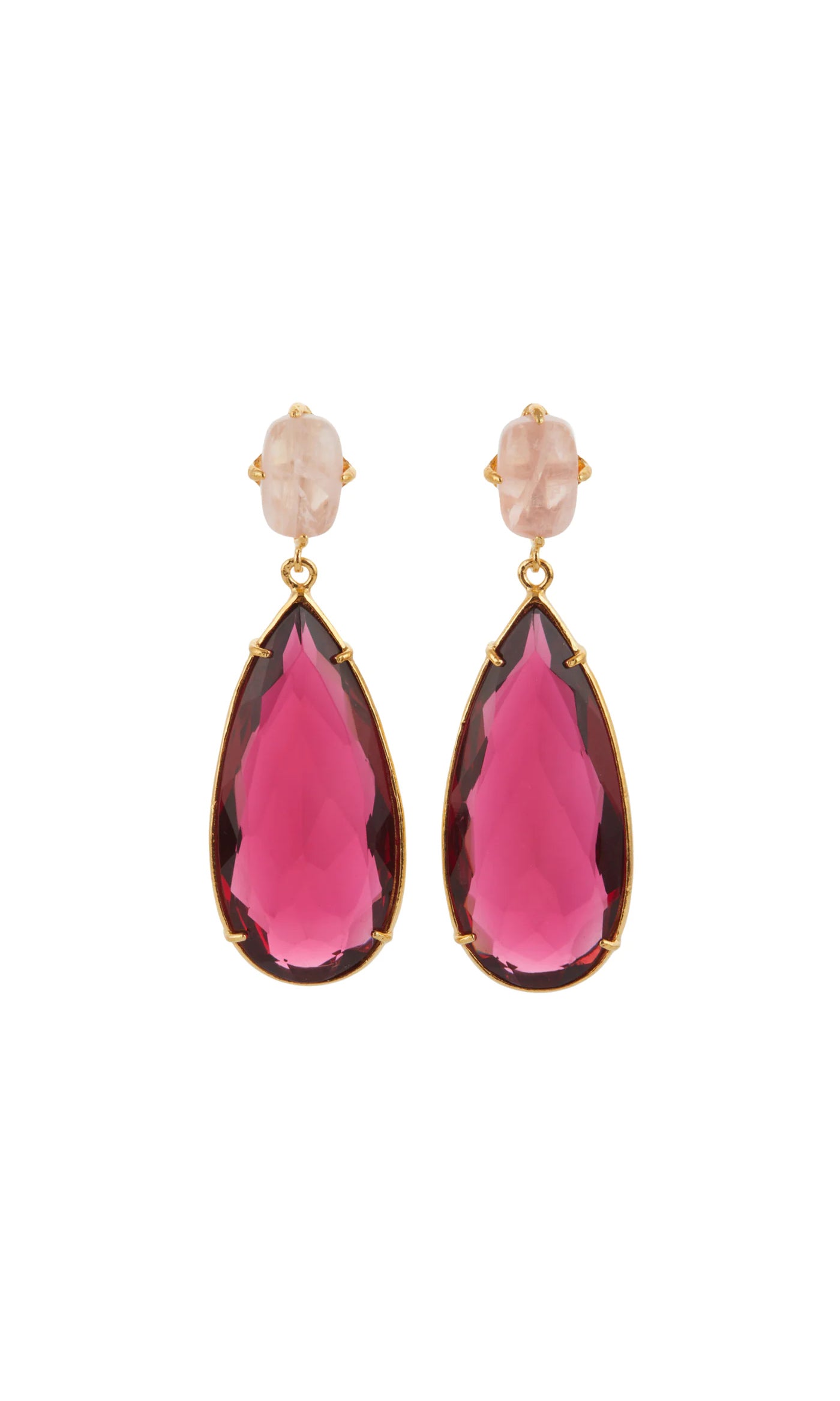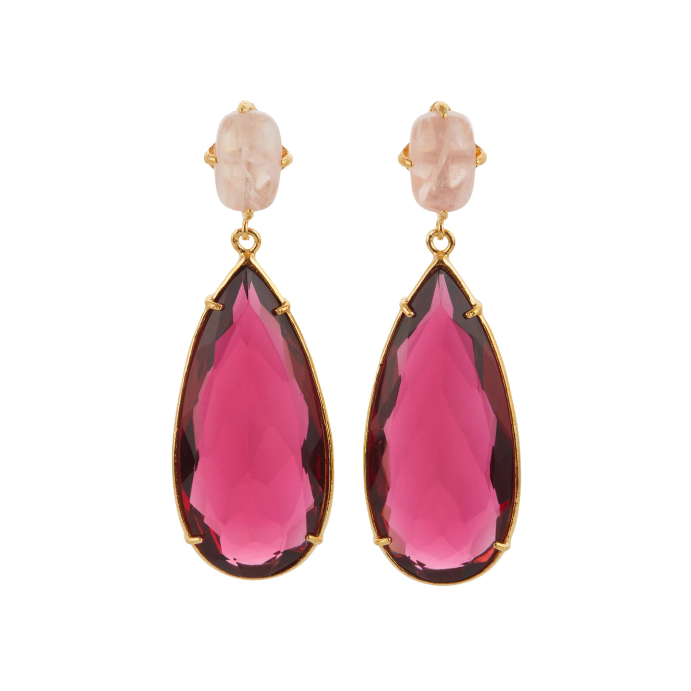 The handcrafted Franca Earrings in Hot Pink are adorned with hot pink-hued and rose quartz crystals.