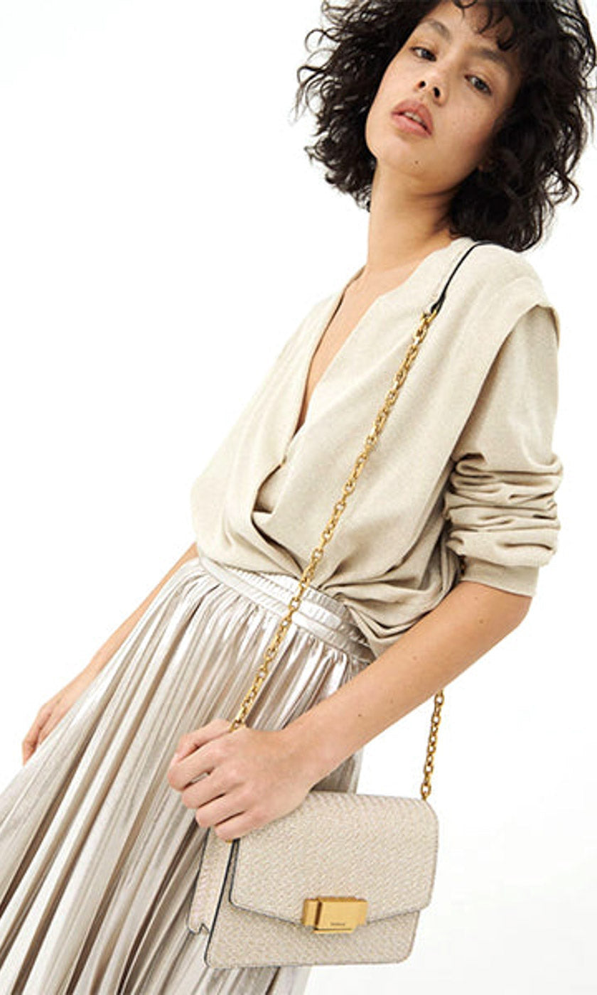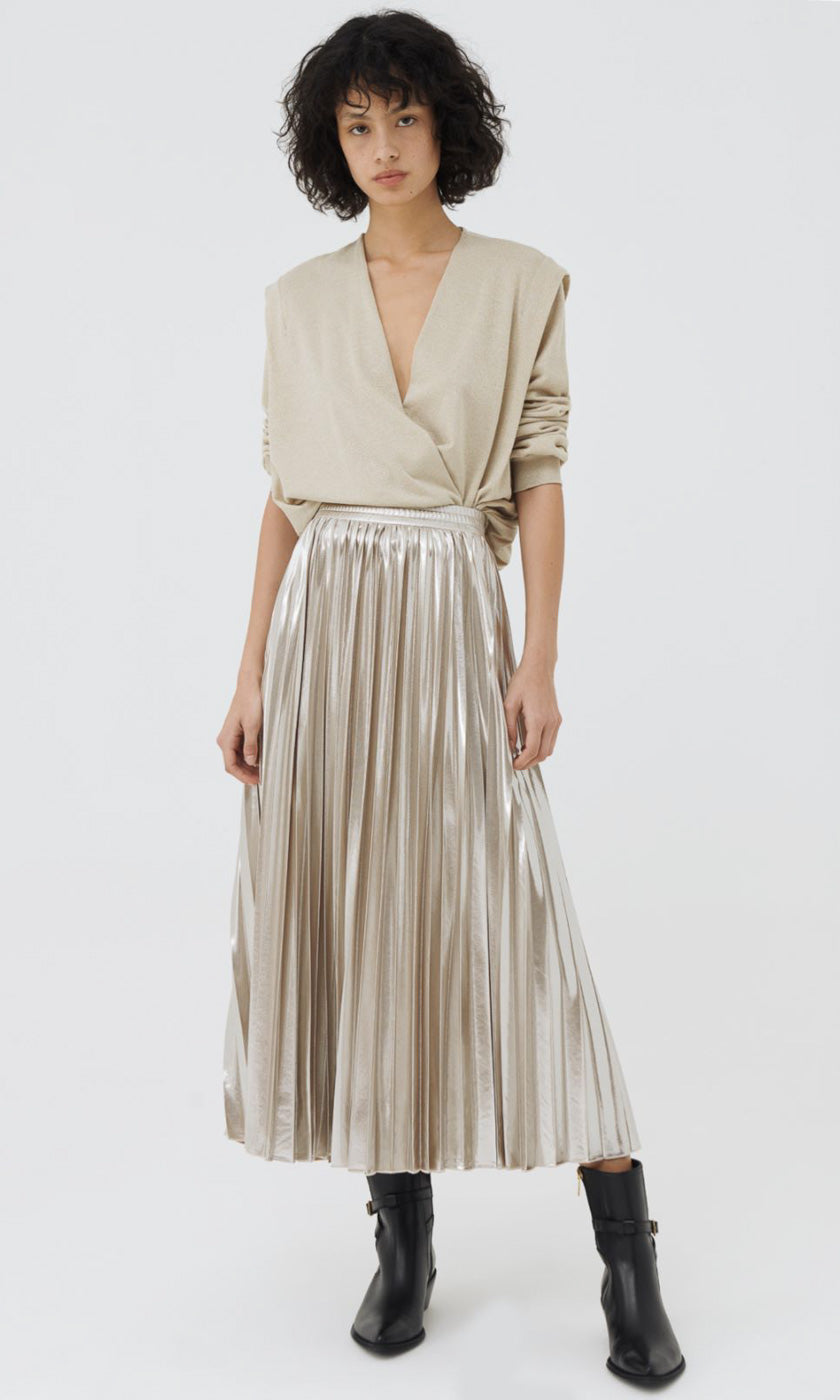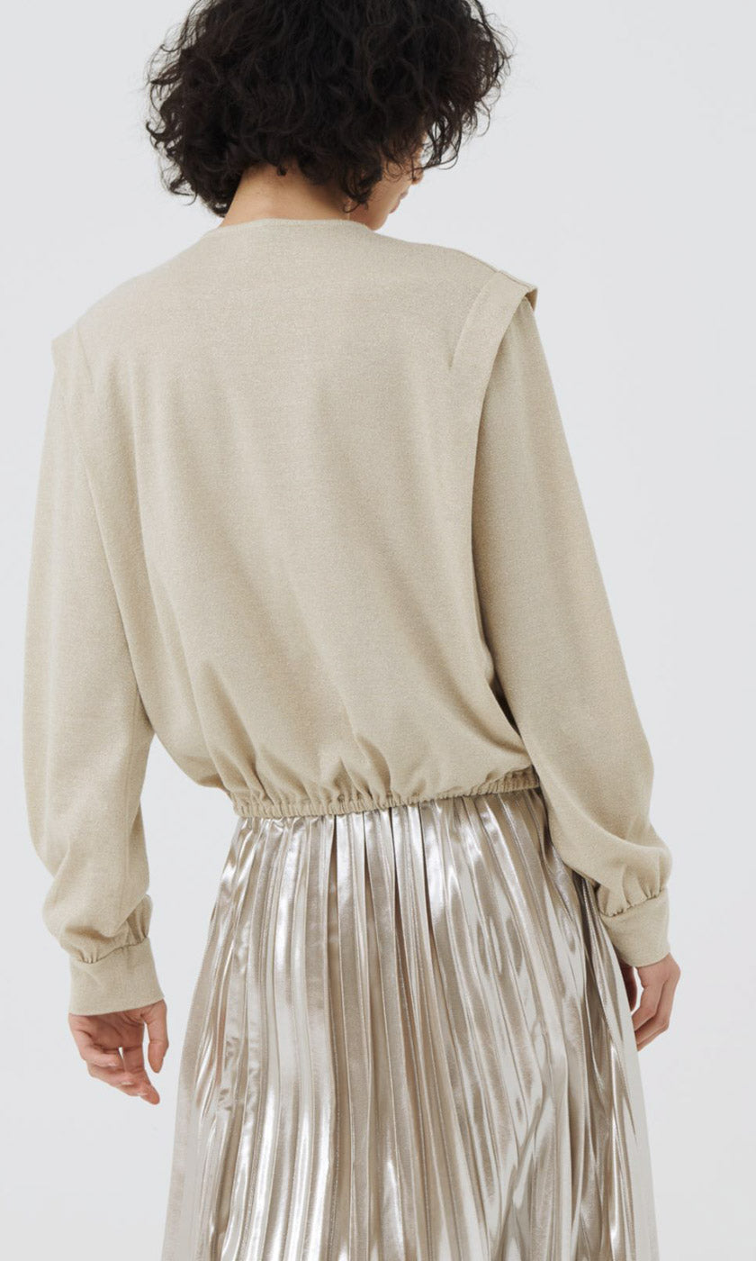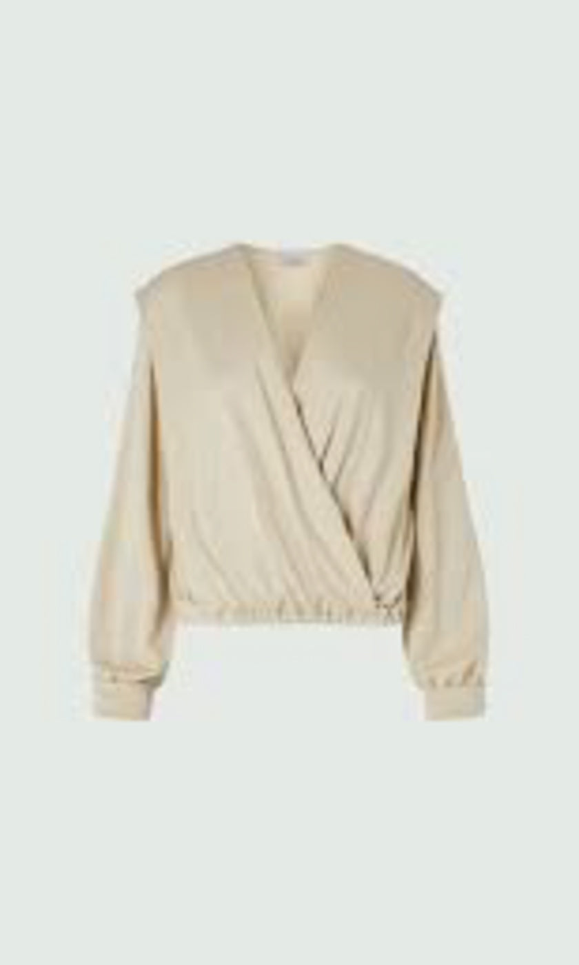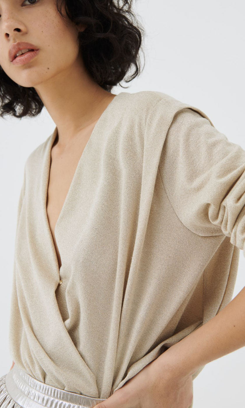 Crossover V neckline, darts on the shoulders, long cuffed sleeves.