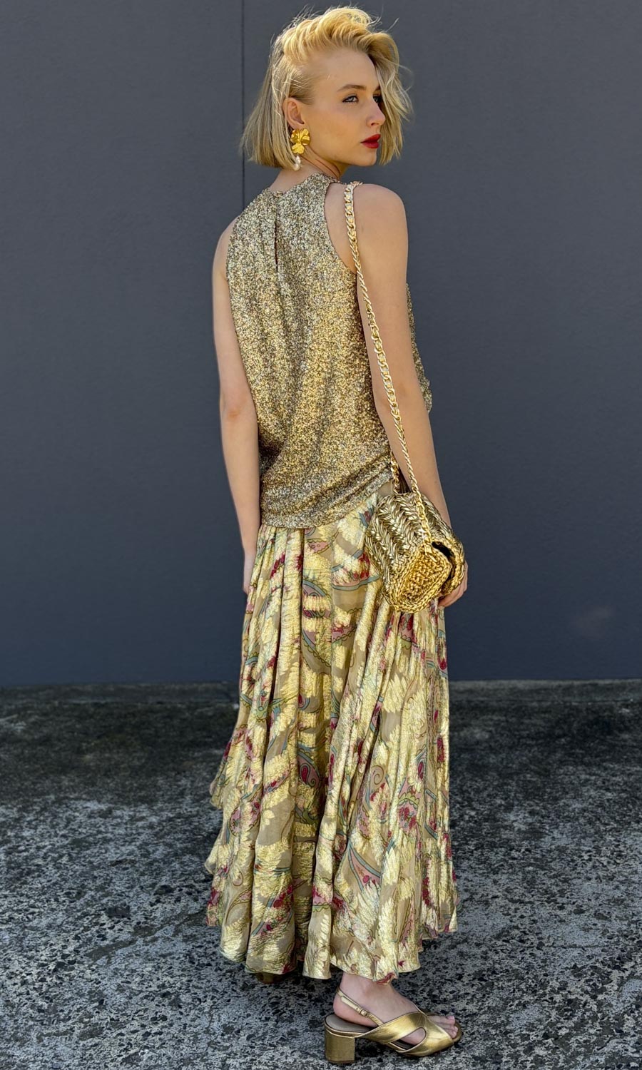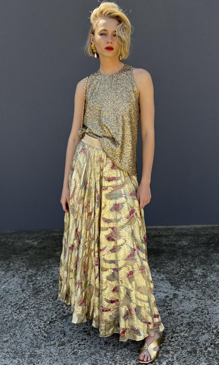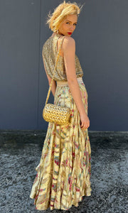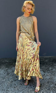 Soft and flowing skirt in chiffon viscose, adorned with a tie and dye gradient print in vibrant shades of yellow and pink. gold band at waist.