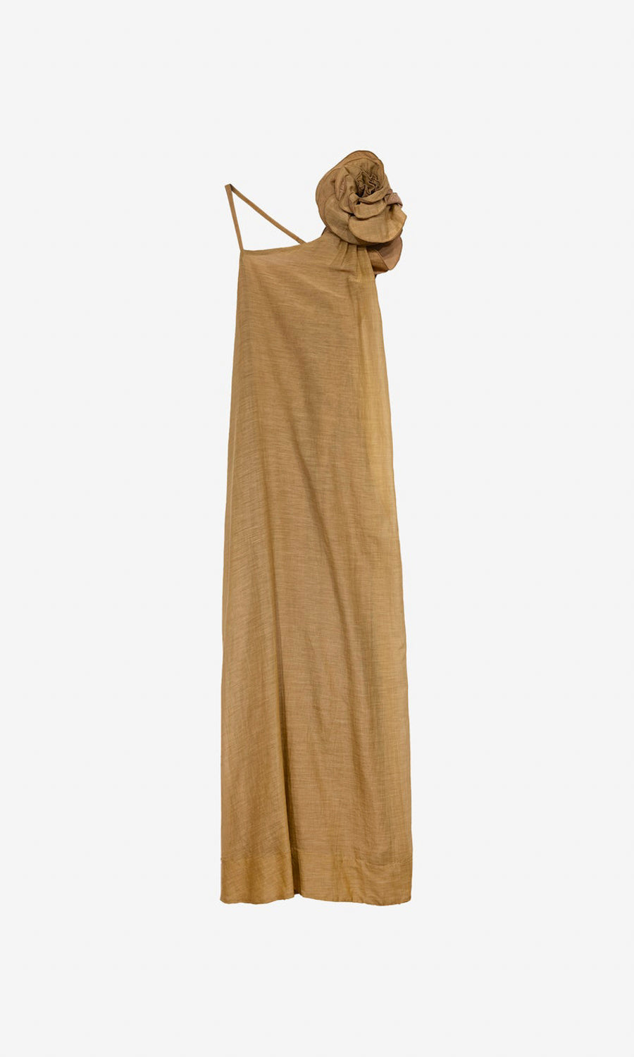 This long Silk mix trapeze-shaped dress stands out through the noble look of its cotton and silk blend, in earthy ochre.