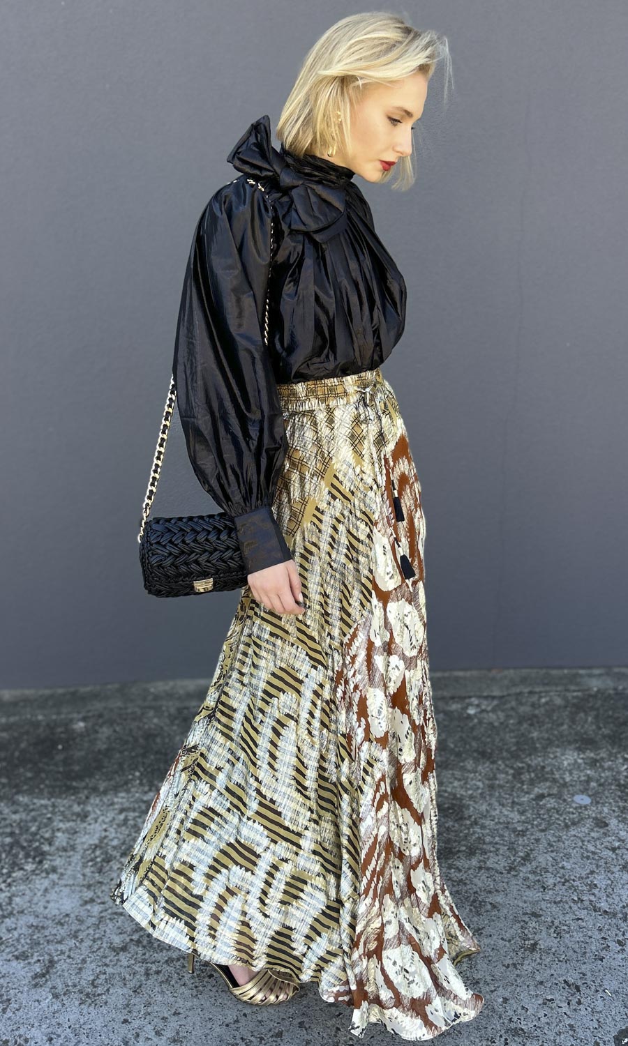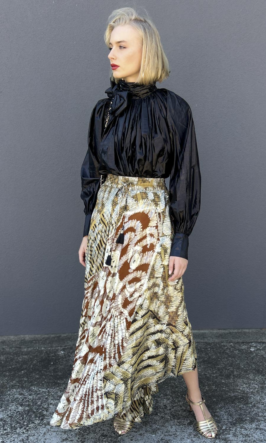 Made from a lamé viscose fabric and shimmering gold thread.