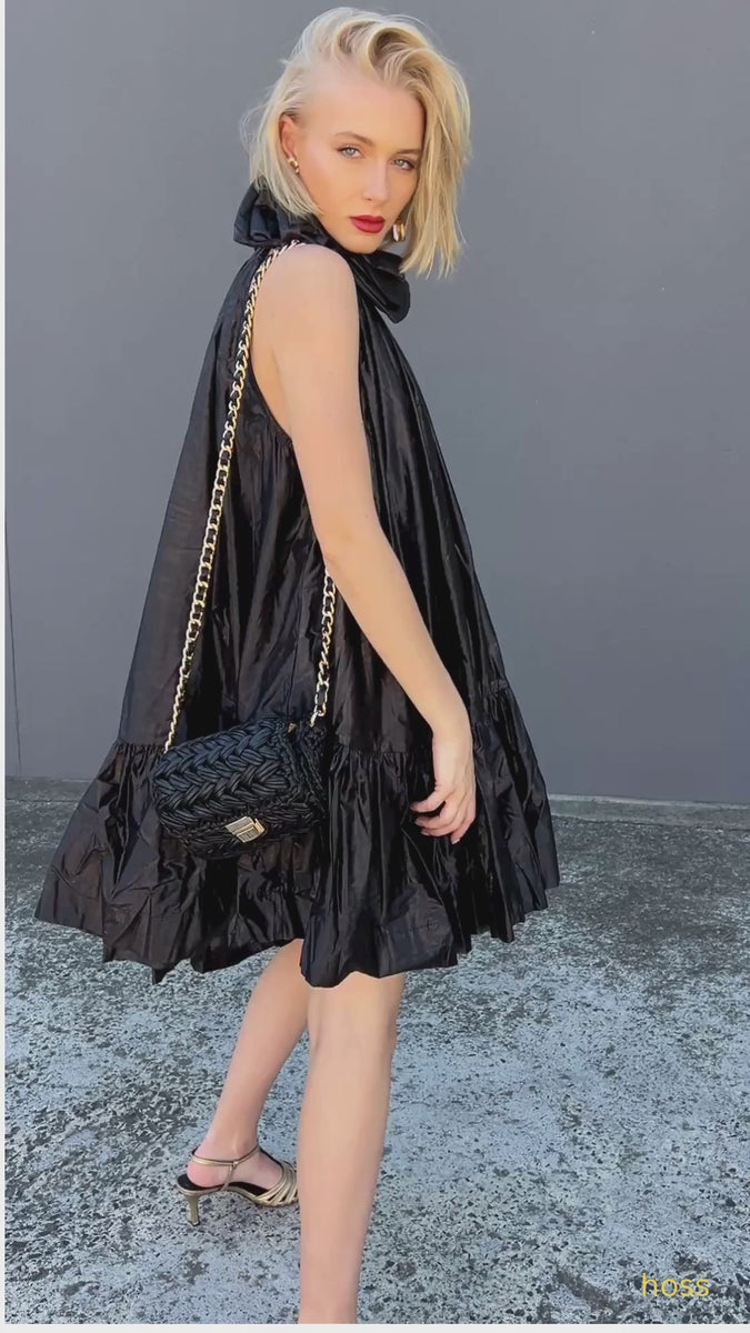 This feminine dress in a type of rich black lumniere fabric is a perfect blend of style and glamour.