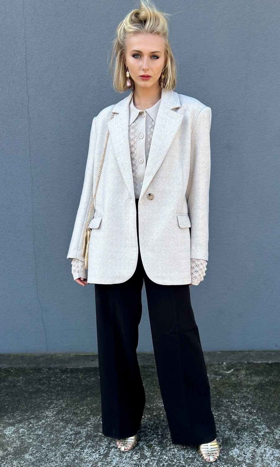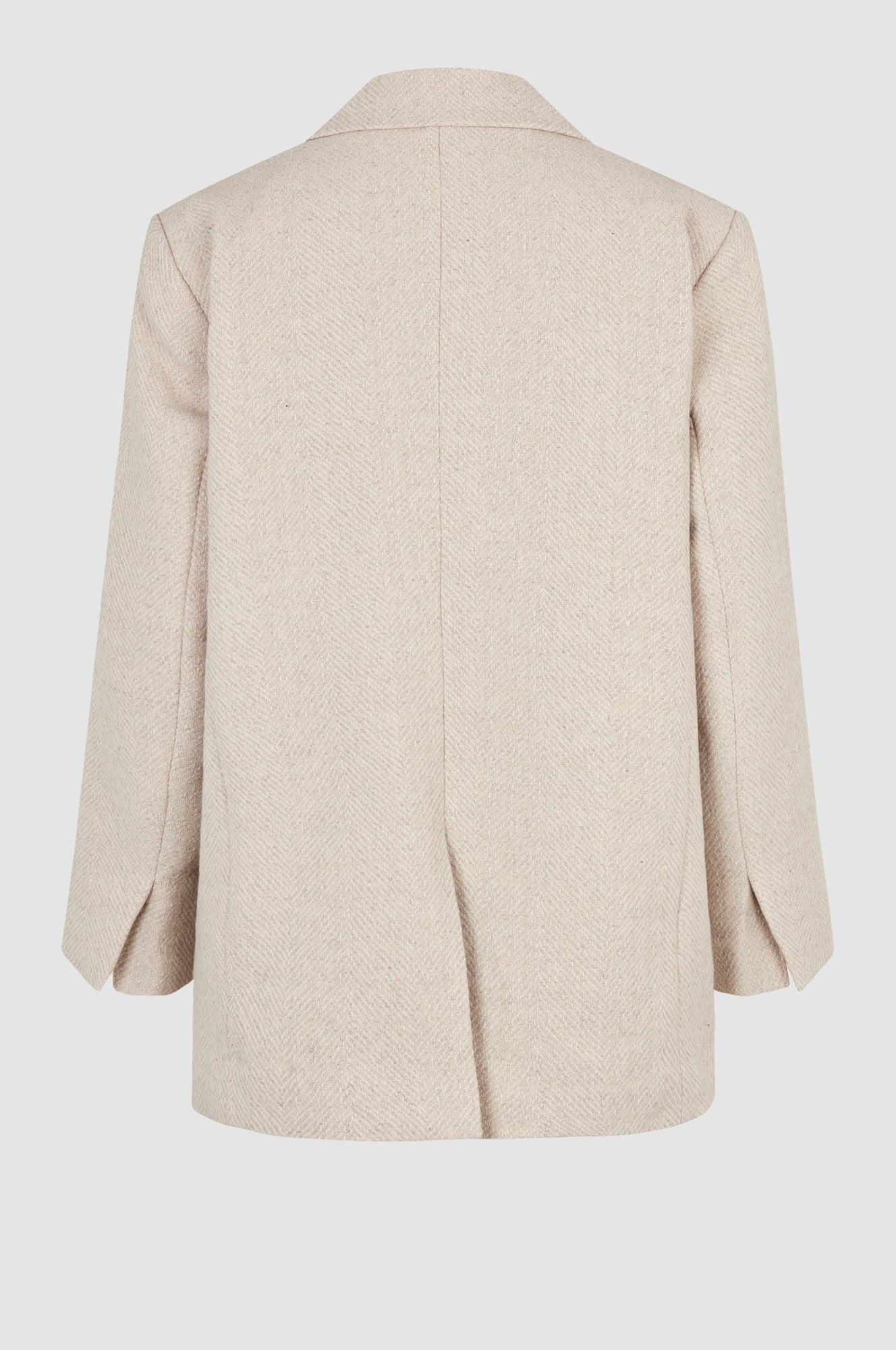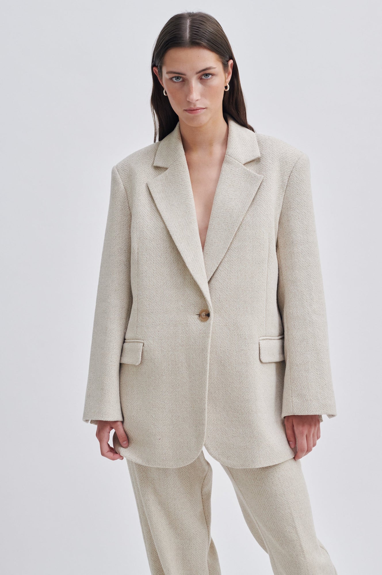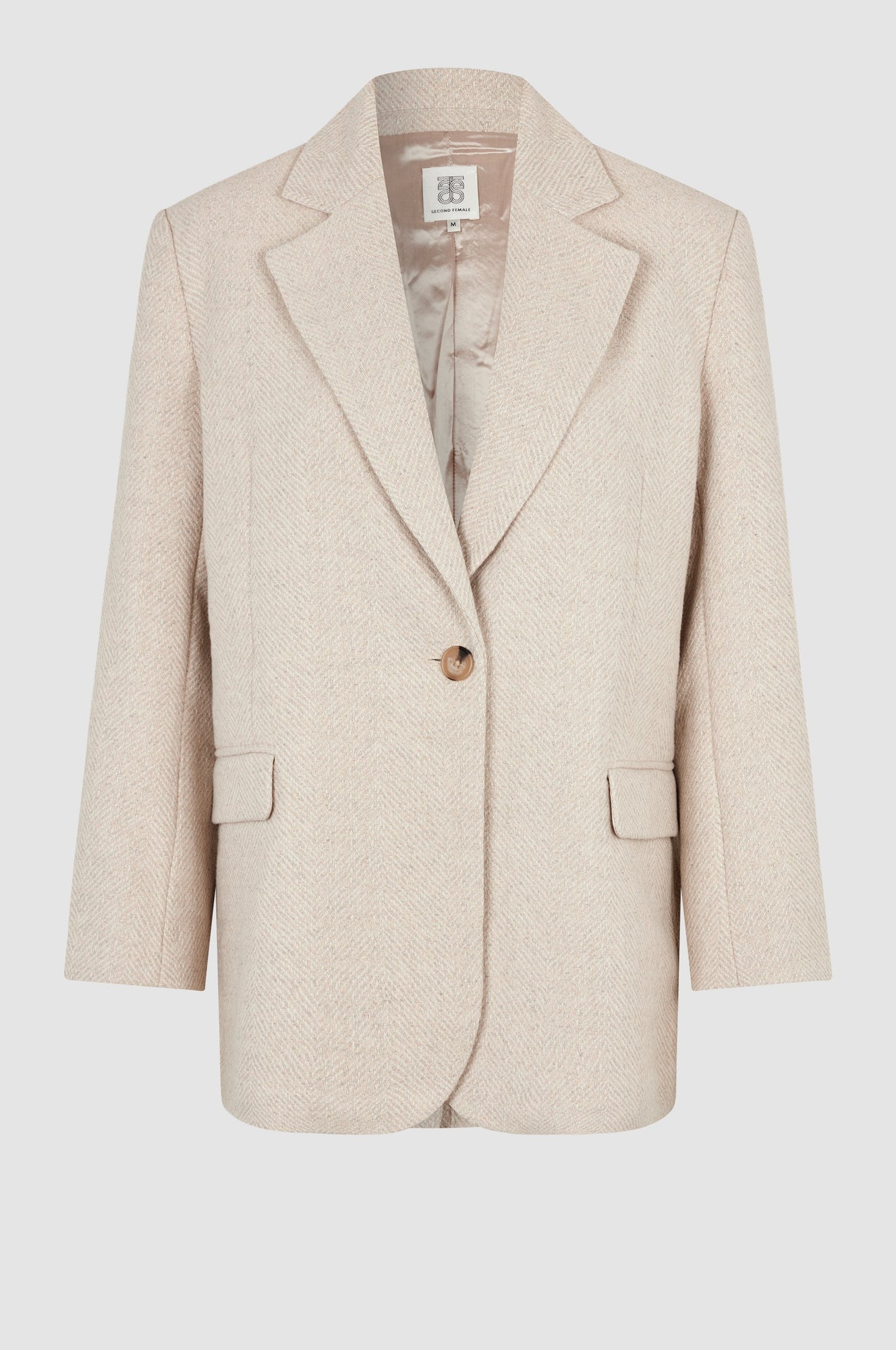 Second Female herringbone blazer. Made in a soft fabric blend with a woven herringbone pattern. Featuring a wide notch lapel and single-button fastening at the front. Padded shoulders and long sleeves with slits at cuffs. Two flap pockets at the front. Slit at back. Fully lined. Loose and drapy fit.