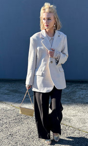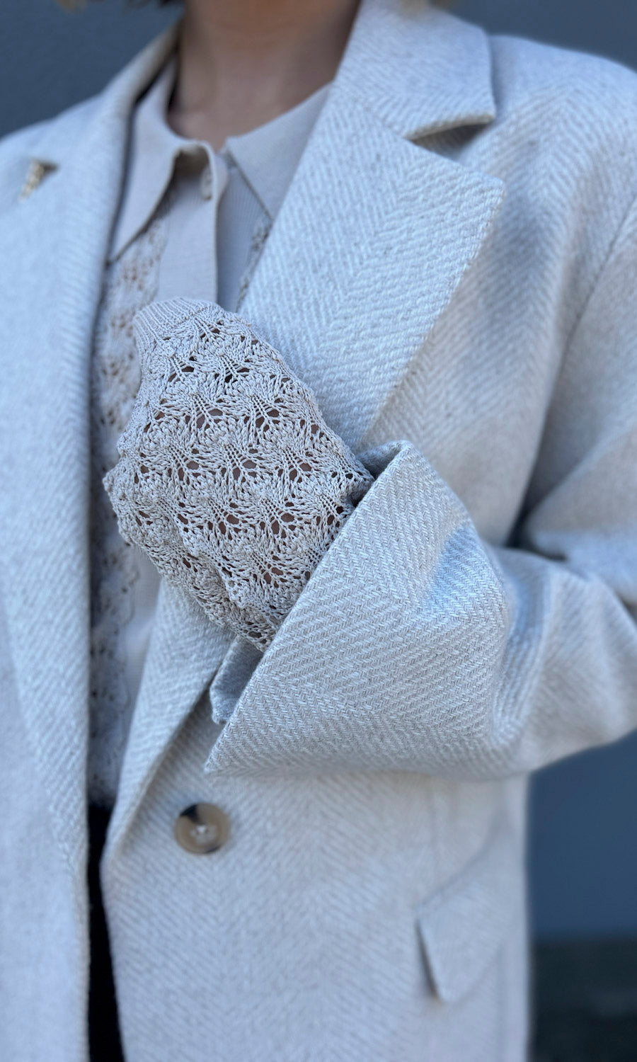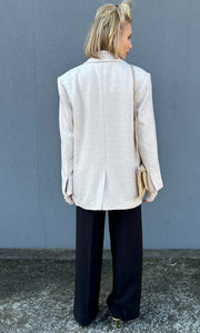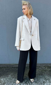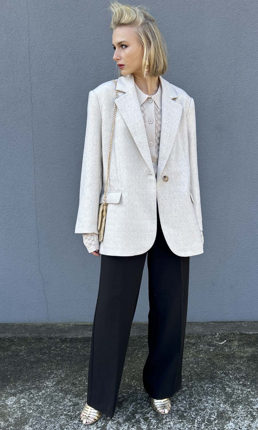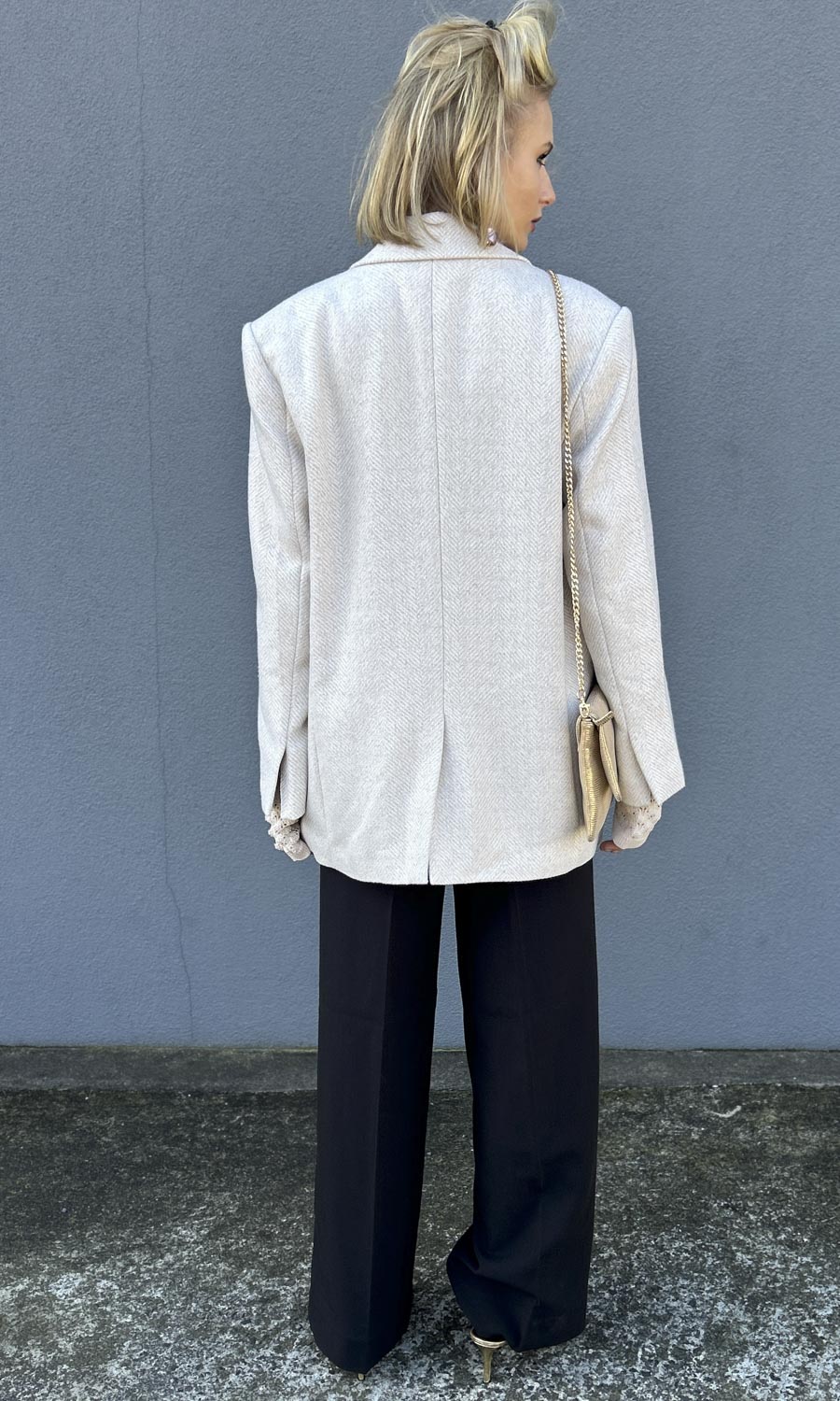Second Female herringbone blazer. Made in a soft fabric blend with a woven herringbone pattern. Featuring a wide notch lapel and single-button fastening at the front. Padded shoulders and long sleeves with slits at cuffs. Two flap pockets at the front. Slit at back. Fully lined. Loose and drapy fit.