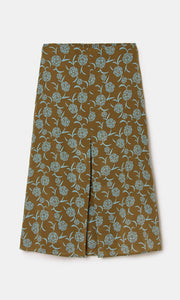 Midi skirt in printed pure silk crepe de chine. The relaxed straight line is given fullness by two central box pleats. Regular waist with elasticated back, side seam pockets. Made in Italy.