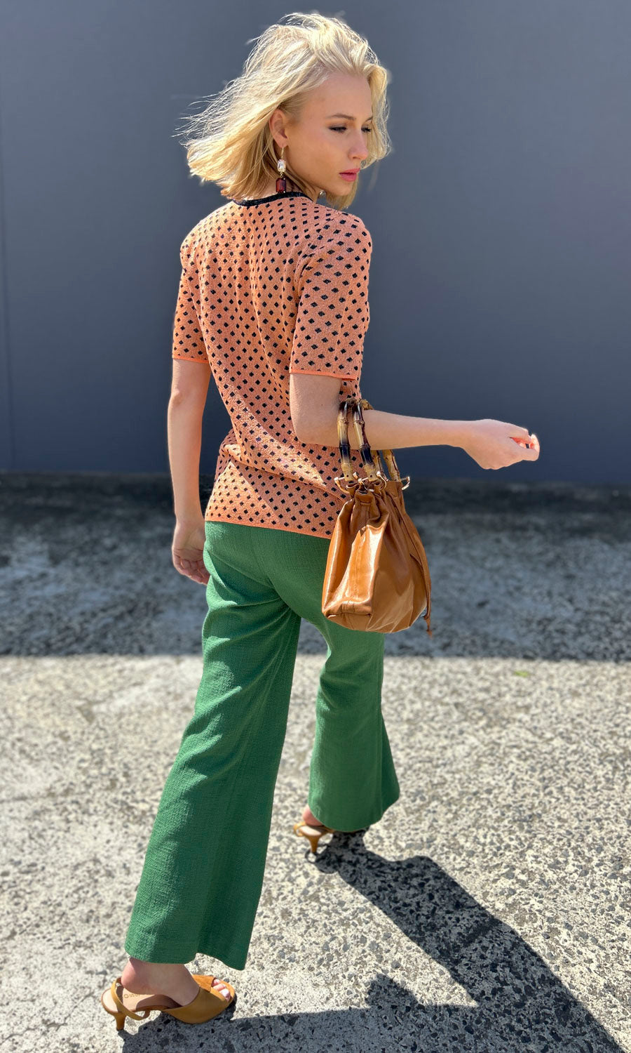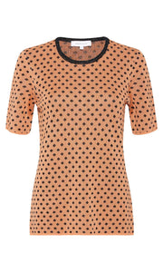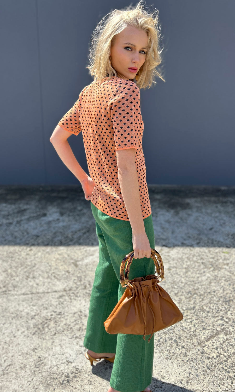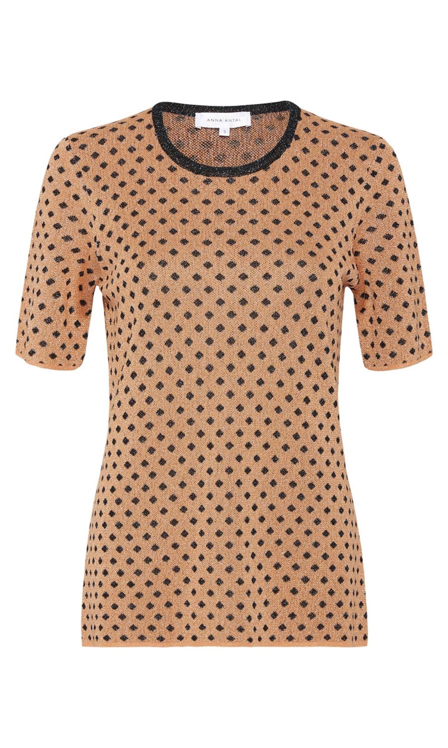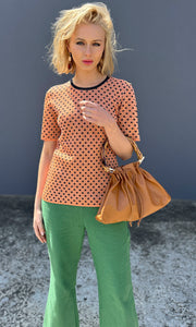 Recalling eye-catching styles from the 1960s, this knitted top in a shimmering sherbet coloured metallic jacquard-knit is considered the gold standard. Knitted in Romania, the flattering short-sleeved fitted top features a round neck with a contrasting black trim. Designed to pair with the SHERBET lurex pencil skirt.