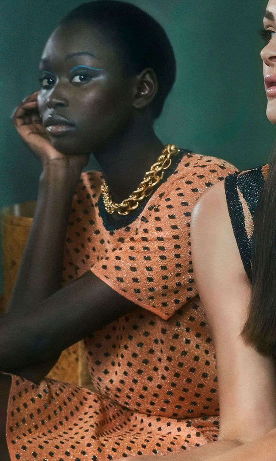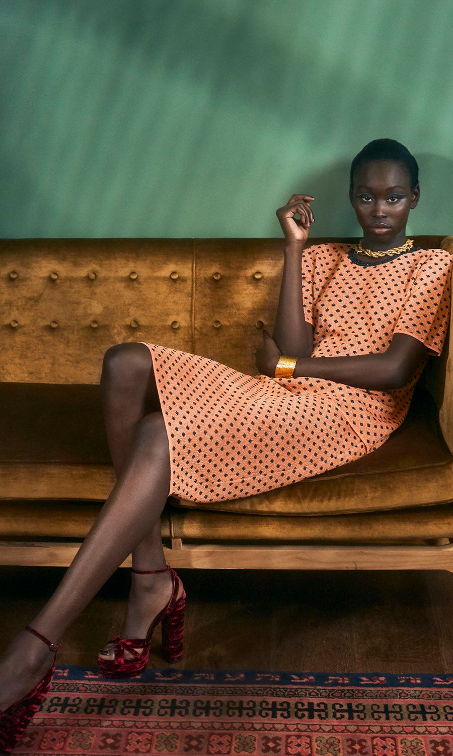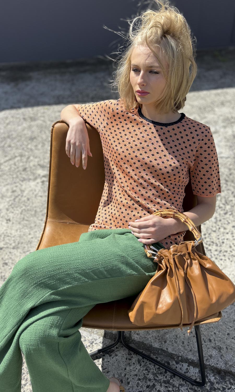 Recalling eye-catching styles from the 1960s, this knitted top in a shimmering sherbet coloured metallic jacquard-knit is considered the gold standard. Knitted in Romania, the flattering short-sleeved fitted top features a round neck with a contrasting black trim. Designed to pair with the SHERBET lurex pencil skirt.