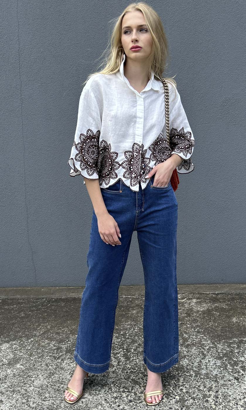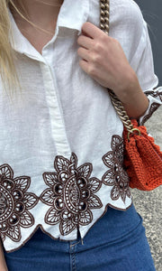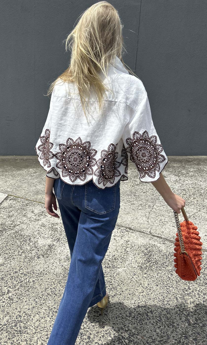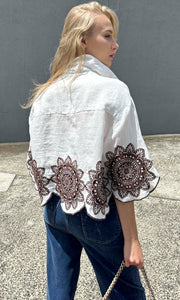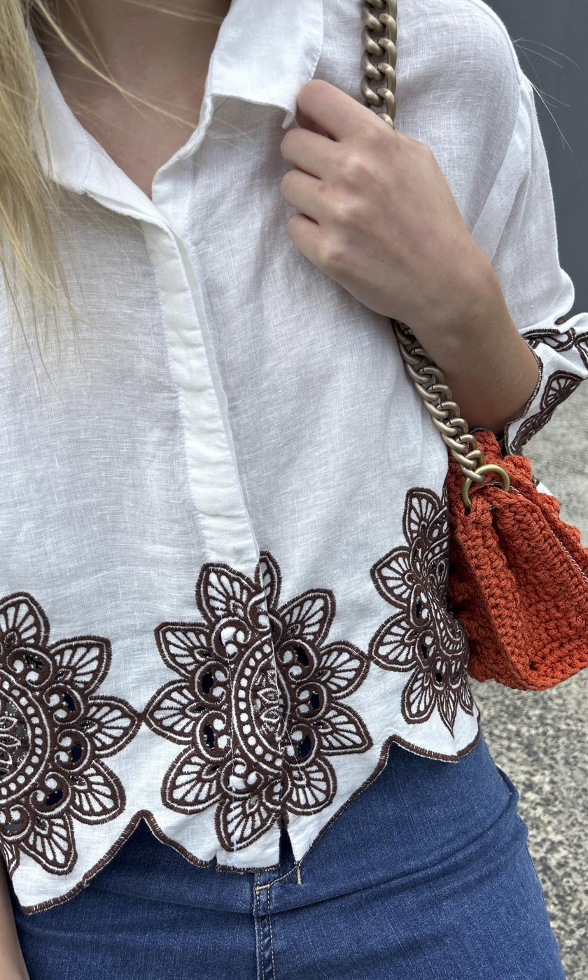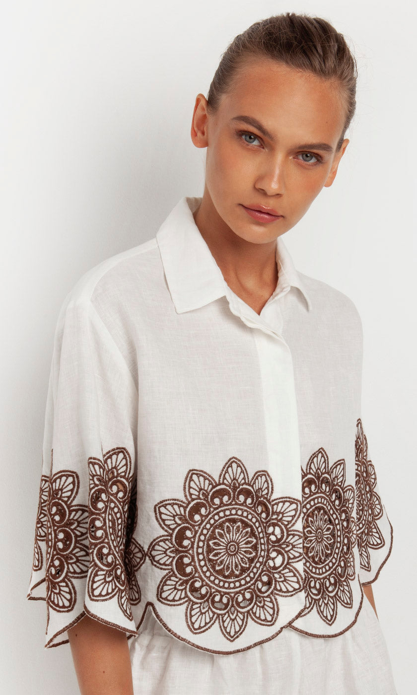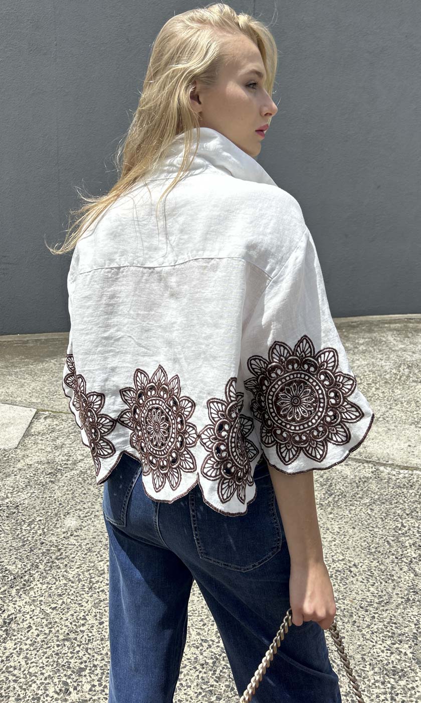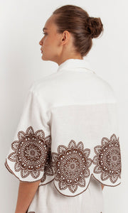 100% linen shirt with light chocolate Linen Embroid Circular flower motifs front and back. Lightweight for Summer flare shape from chest area . Button front. Collar neckline. Made in Greece.