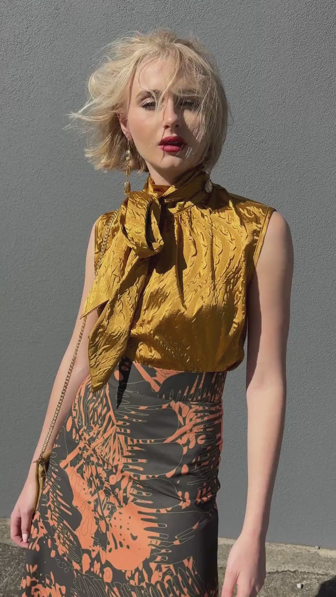 Wear scarf tie as desired draping at back or tie at back or bring to front and tie as shown as desired.