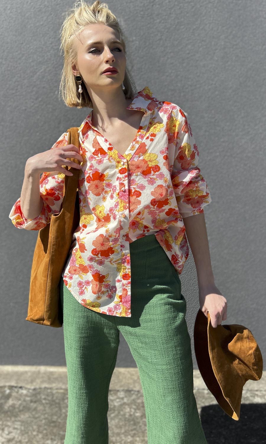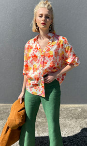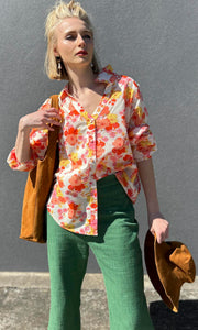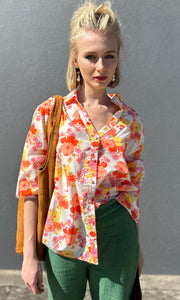 Floral print of reds yellows orange on natural  100% cotton base.