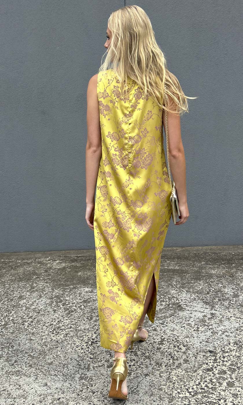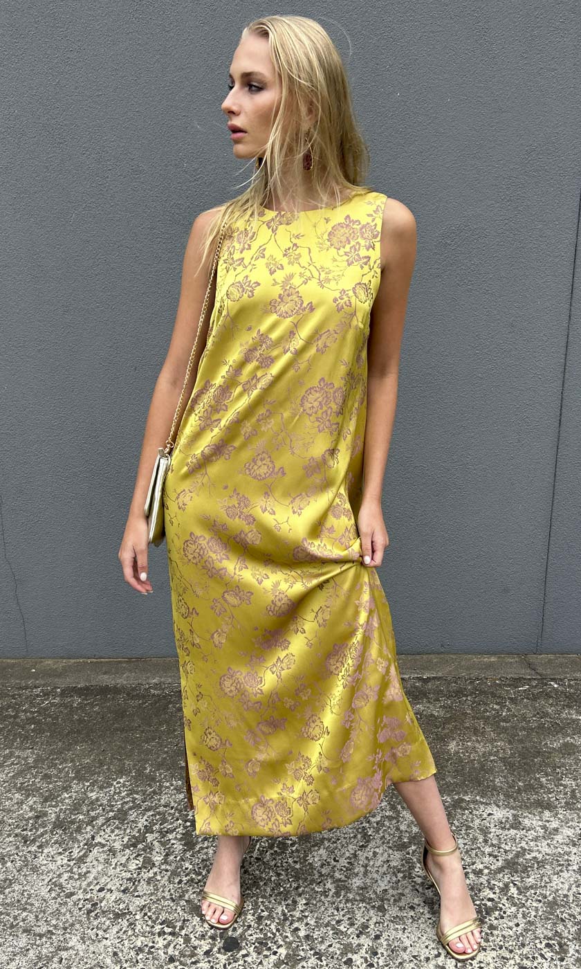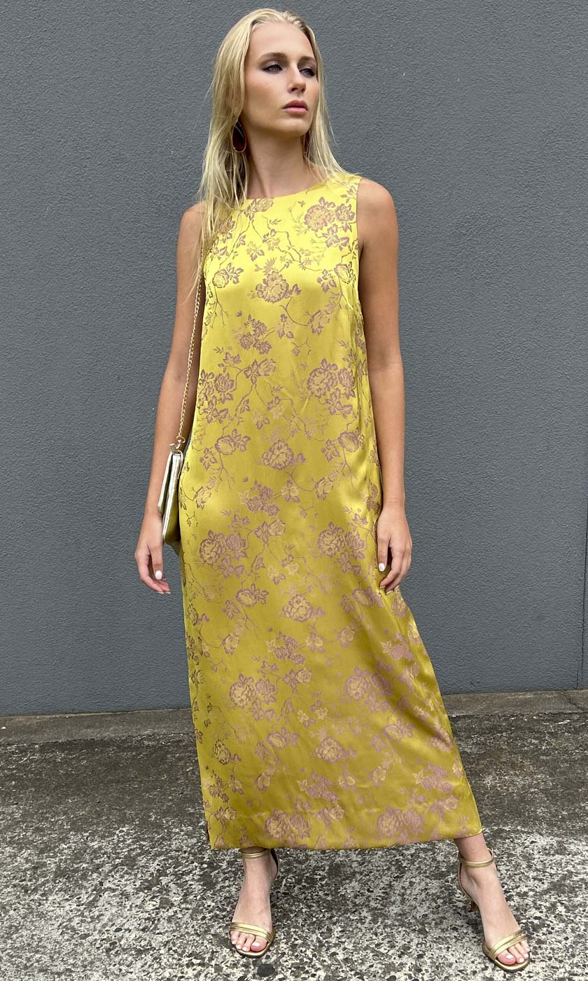 A classic maxi shift style in Silk feel Sateen Viscose in a beautiful Galliano Gold colour way.