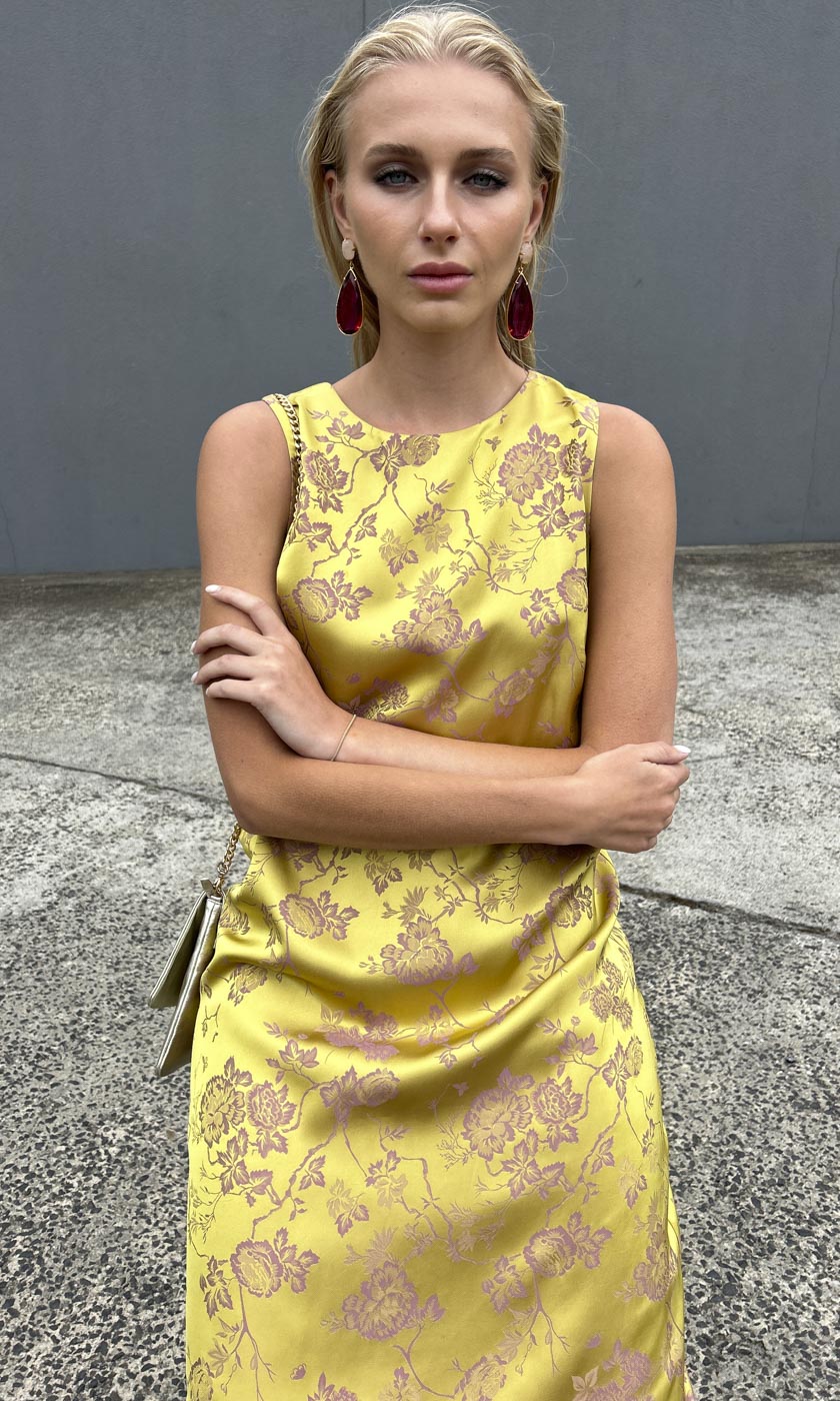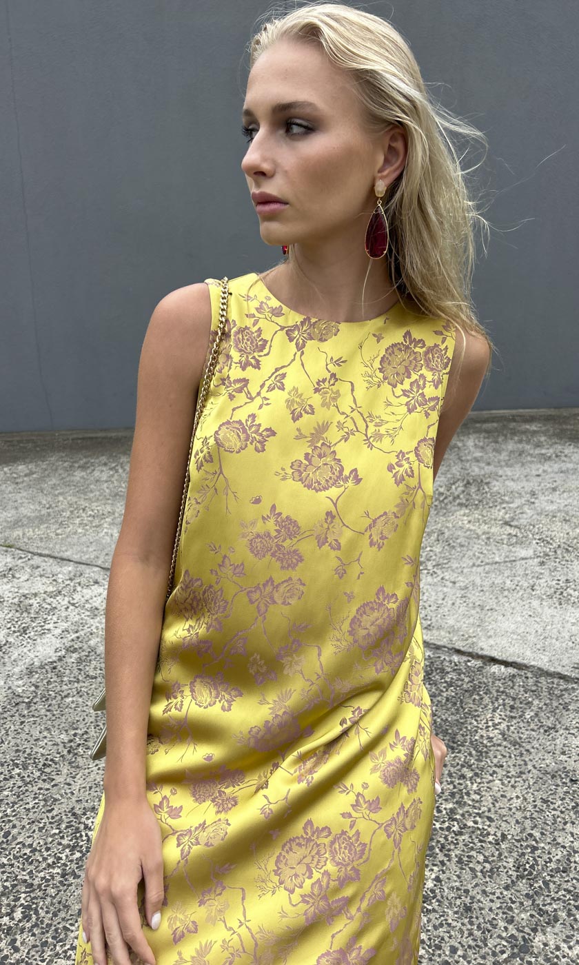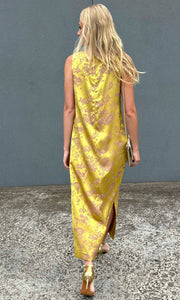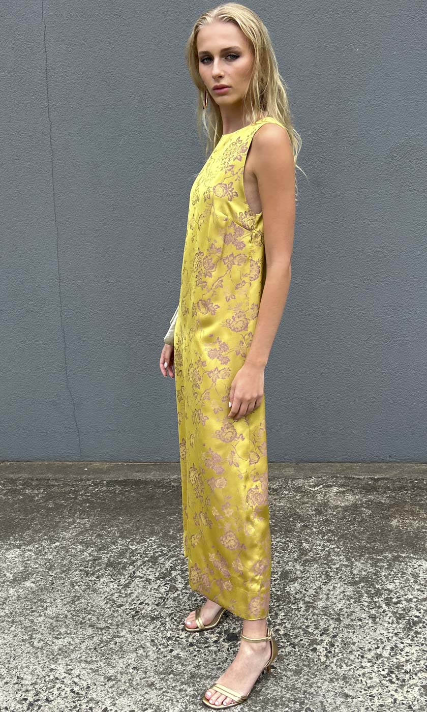 A classic maxi shift style in Silk feel Sateen Viscose in a beautiful Galliano Gold colour way.