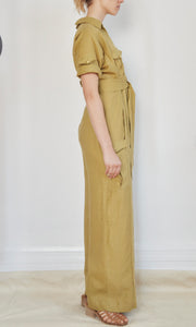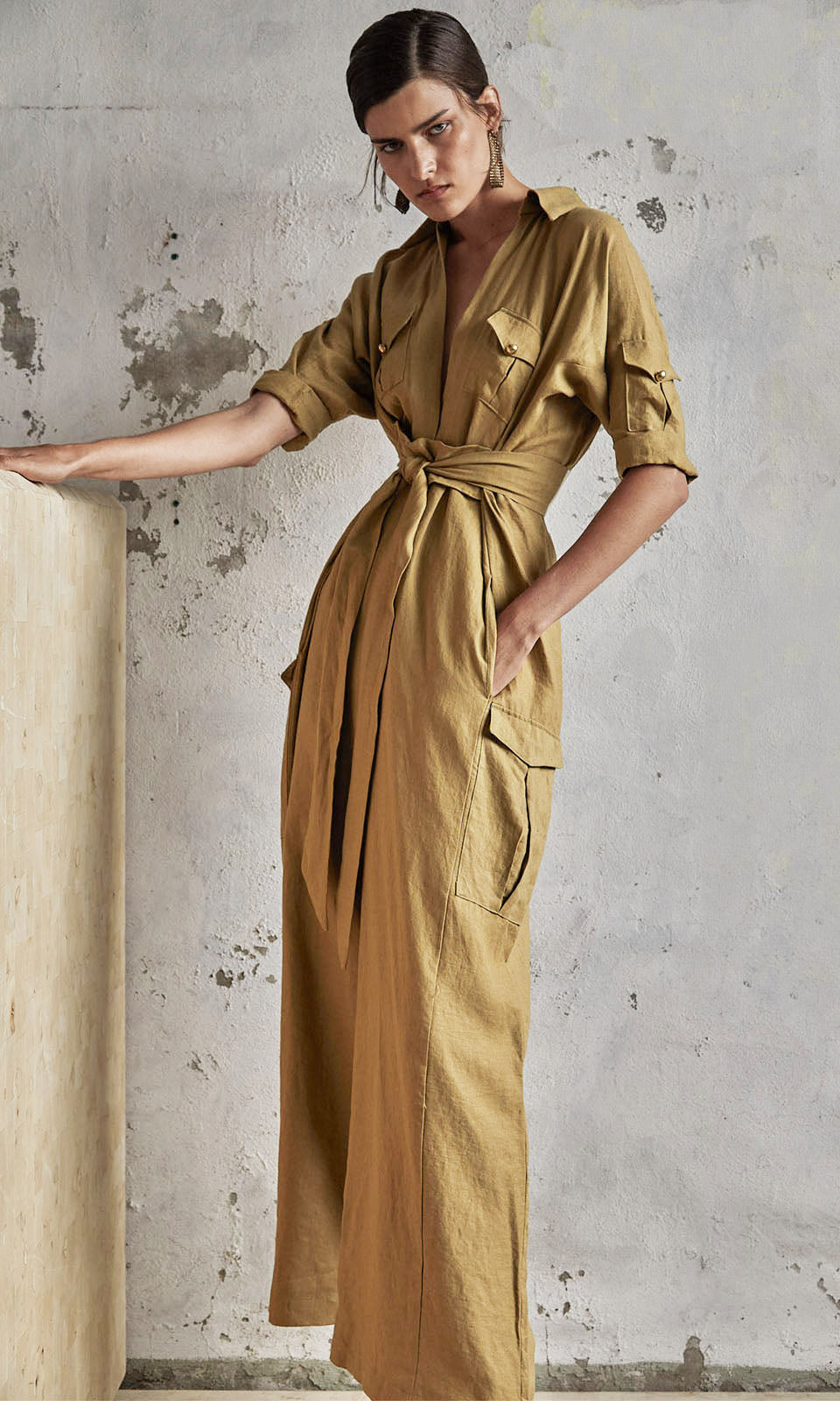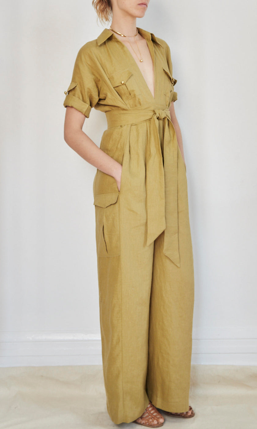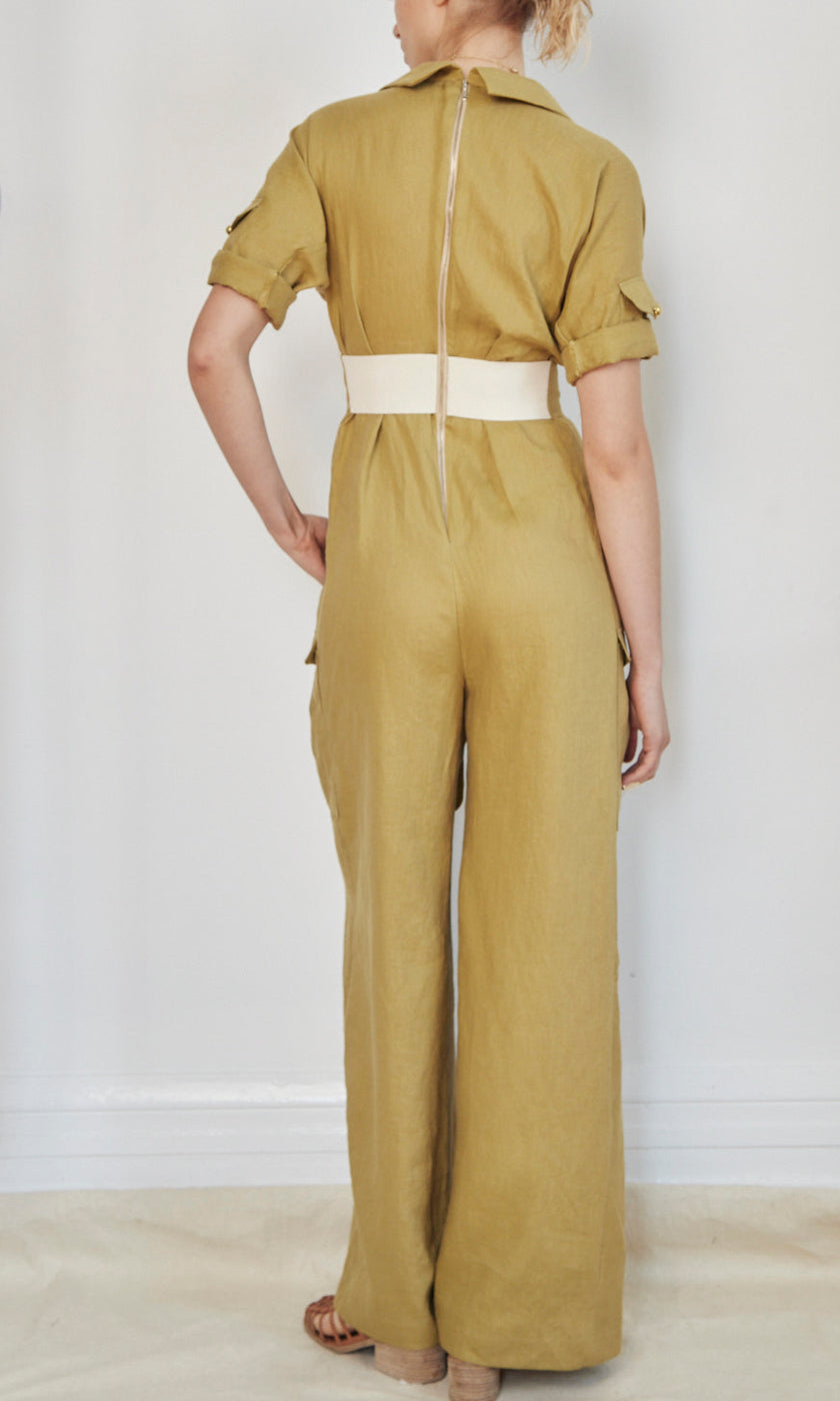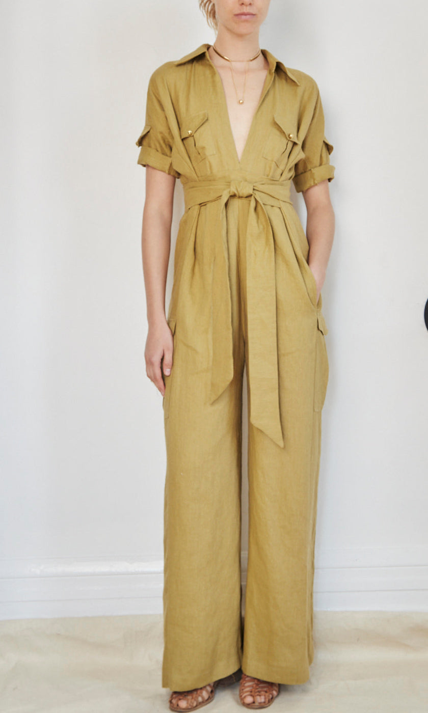 THE 8 POCKET SAFARI JUMPSUIT IS A MUST HAVE WARDROBE ESSENTIAL. MADE FROM 100%, BREATHABLE LINEN, THE SAFARI JUMPSUIT IS A VERSATILE PIECE CAN BE DRESSED UP OR DOWN. FEATURING DOME BRASS PRESS STUDS AND FLATTERING CUT. WITH ITS CARGO STYLE FEATURES, COMPLIMENTED BY THE FEMININE SILHOUETTE AND PLUNGING NECKLINE, THIS JUMPSUIT IS TRULY A STAtement PIECE.