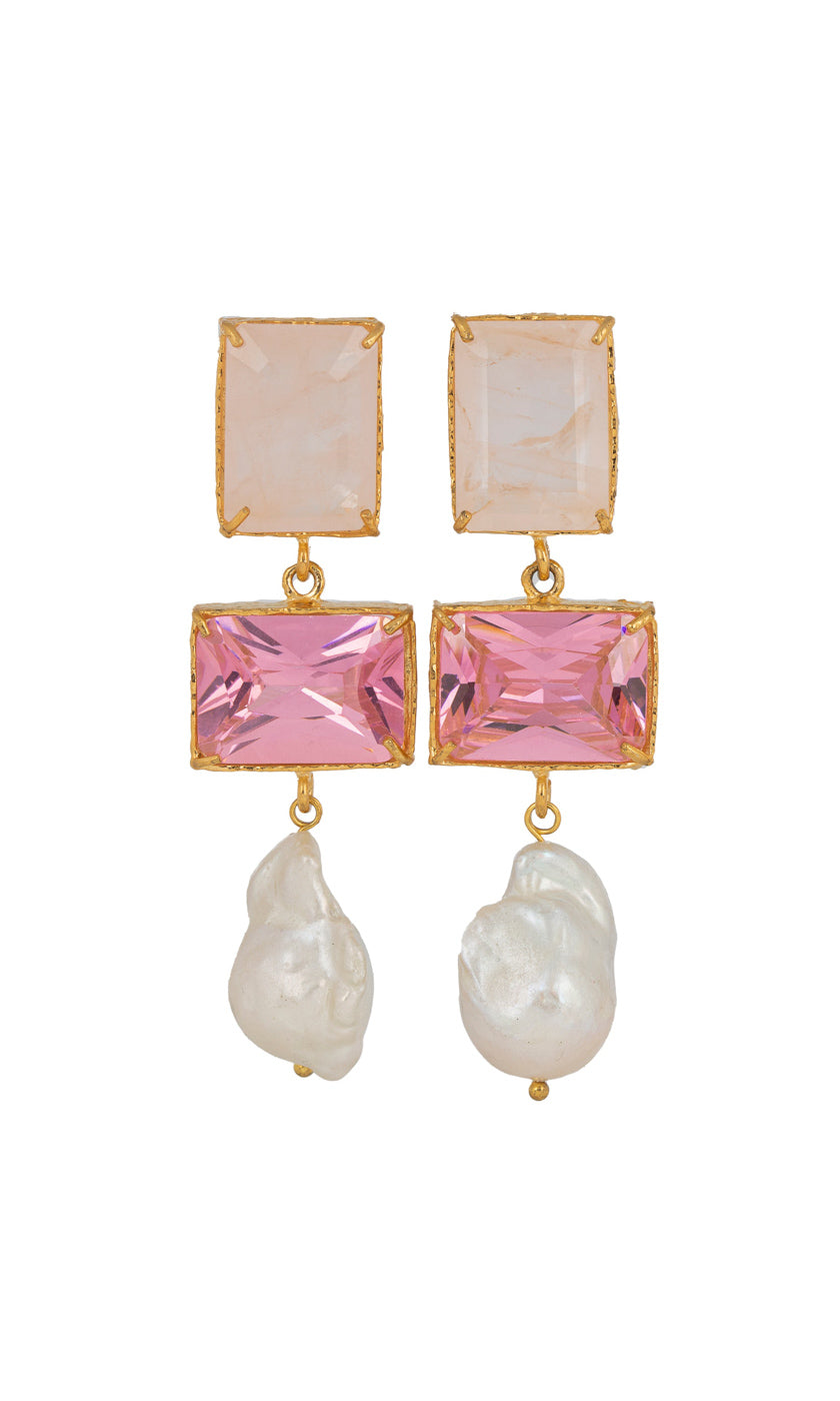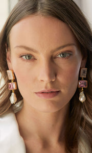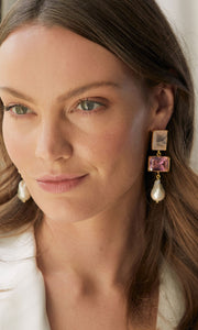 The handcrafted Bettina earrings are adorned with pink hued crystals, accented by lustrous, freshwater Baroque Pearls.
