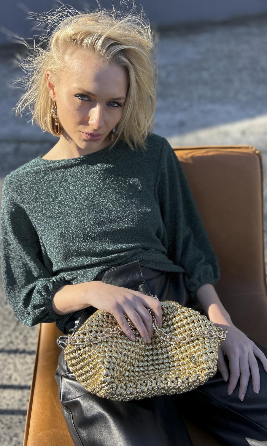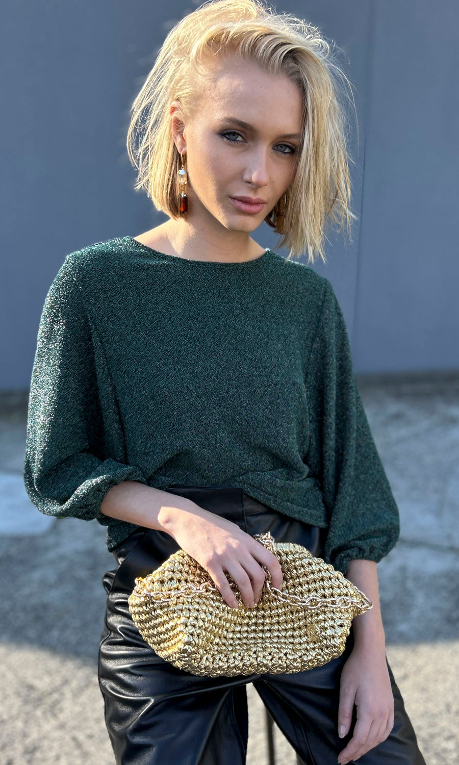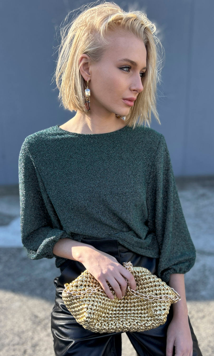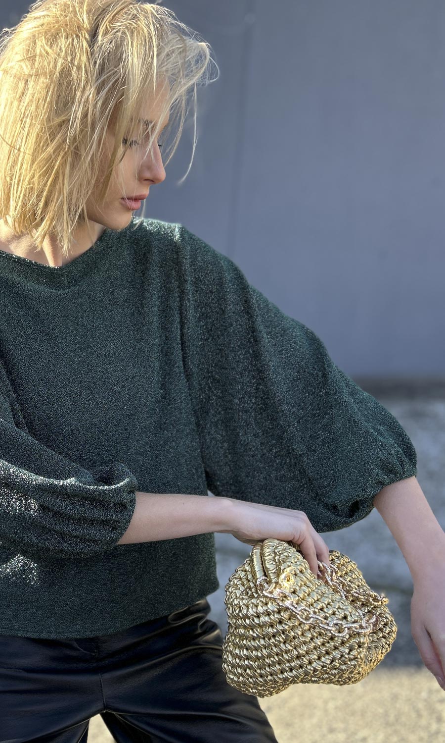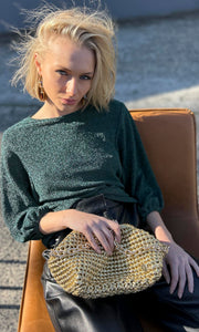 A beatiful emerald green knitted metallic on a black inner knitted base.
