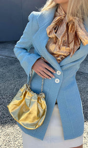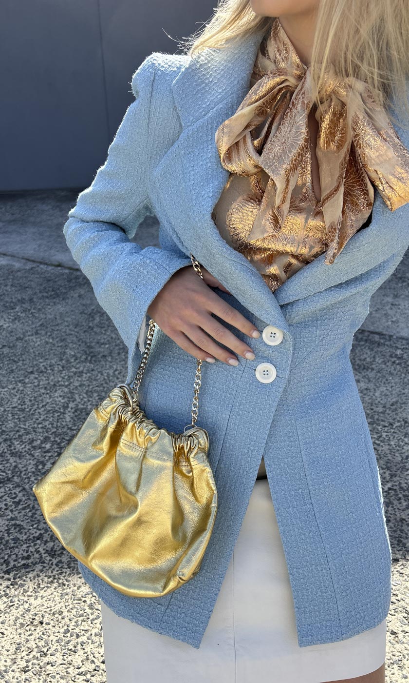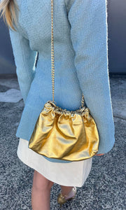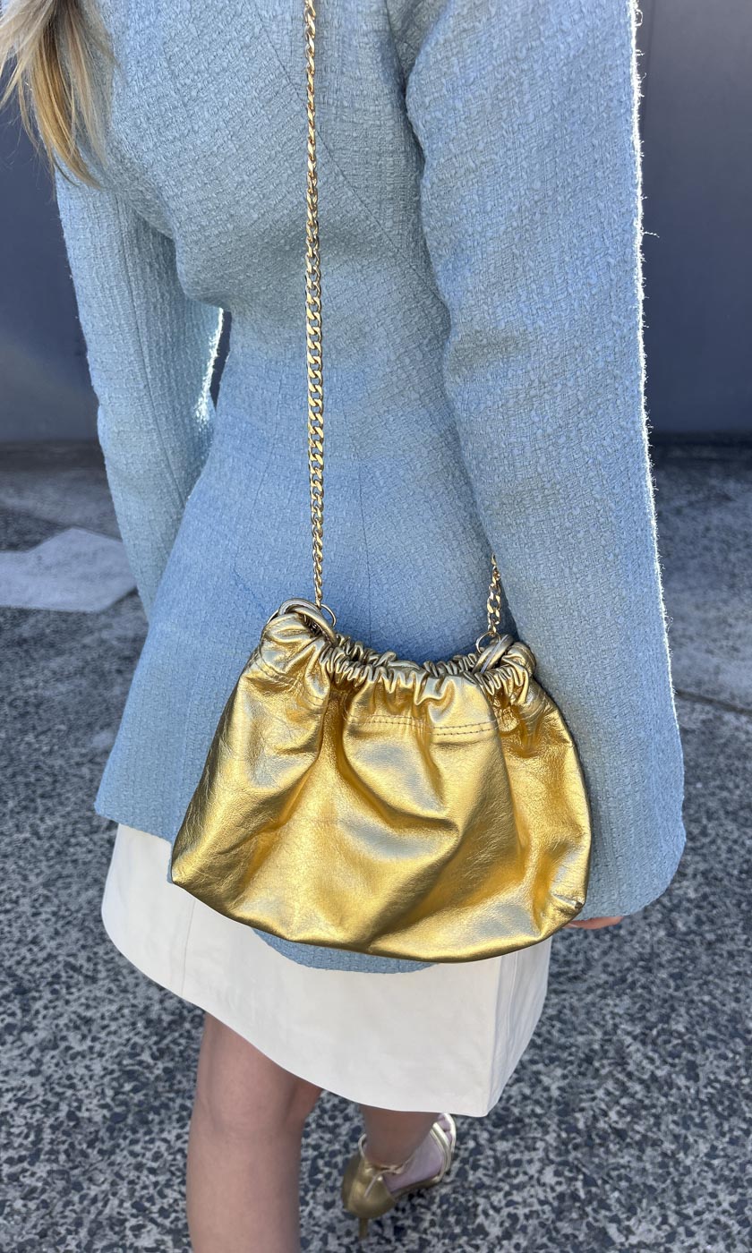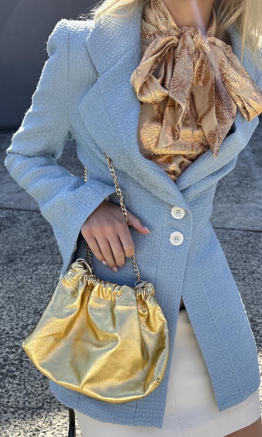 The collective hand bag is made from a tough but soft leather of brilliant gold.