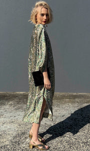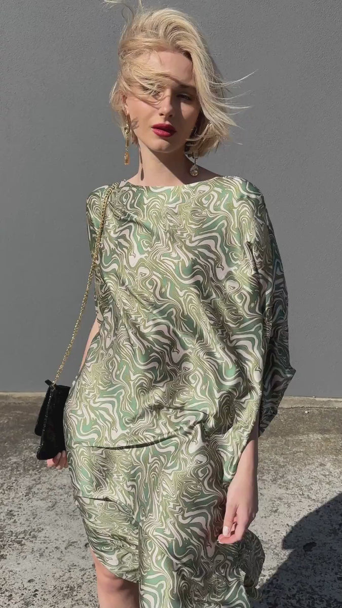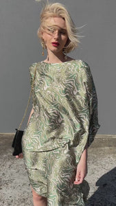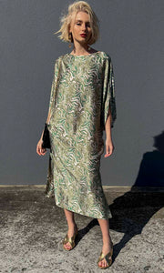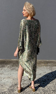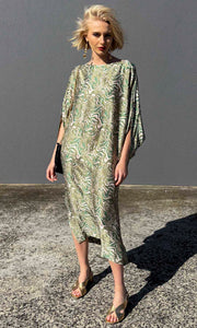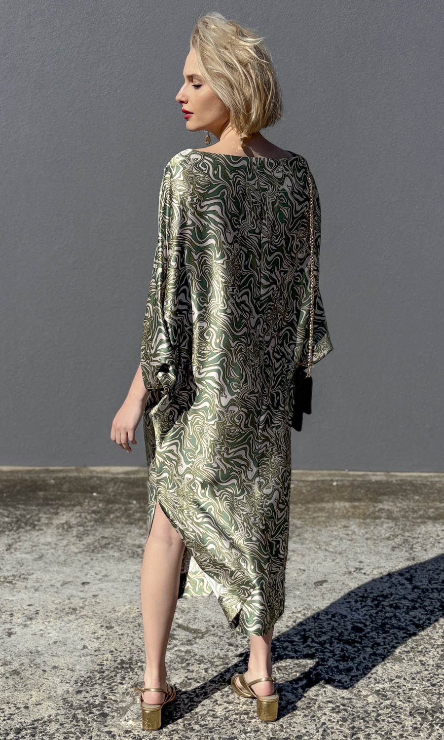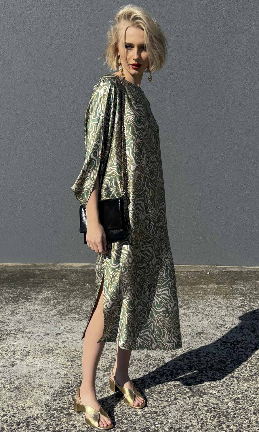 Wide drape sleeves with narrow split from elbow area . Top area of arm covered..
